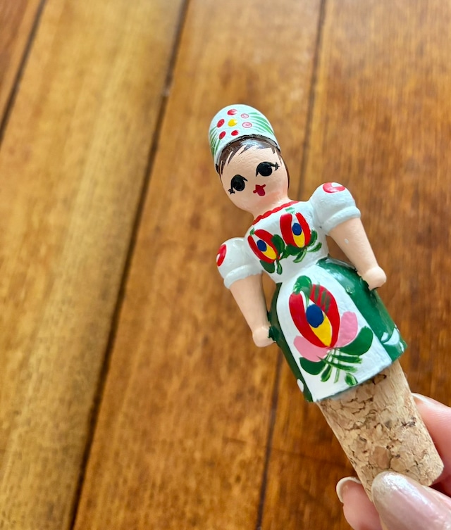ボトルストッパー 人形ワインコルク インテリア 雑貨 木製 ヨーロッパ 女の子|Bottle Stopper Doll Wine Cork Interior Decor Wooden European Girl 可愛らしい人形のボトルストッパー。 民族衣装を思わせる鮮やかな色彩と絵付けが素敵です。 ワインボトルの上にこのストッパーがあるとワインの味も美味しくなりそうです。 兵隊さんの人形のものもあります。 東欧ハンガリー製と思われます。 サイズ:幅40mm、高さ100mm Adorable doll bottle stoppers. The vibrant colors and painting are reminiscent of traditional folk costumes. Having this stopper on top of a wine bottle will surely make the wine taste better. There are also soldier dolls. They are thought to be made in Hungary, Eastern Europe. Size: Width 40mm, Height 100mm