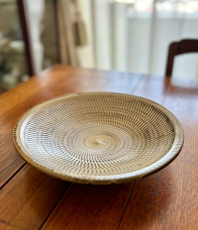 小鹿田焼 大分 飛び鉋 平皿 ディナー皿 黄色 民藝 手仕事 a|Onta Ware, Oita, Tobikanna Flat Plate, Dinner Plate, Yellow, Folk Art, Handmade a 飛び鉋模様が美しい小鹿田焼の手作りディナー皿です。 飛び鉋模様が緻密で、大きさが異なる鉋を持ち替えて制作されています。とても丁寧につくられていることが分かります。華やかで力強い作品です。小鹿田焼の刻印は高台の側面に入っています。 カレーやパスタ 餃子…などどんなお料理にもぴったり。きっと華やかな食卓を演出してくれることでしょう。 小鹿田焼は、桃山時代(16 世紀末)に渡来した朝鮮人陶工によって伝えられ、 小石原窯(現 福岡県朝倉郡東峰村)を経て、現在の大分県日田市大字鶴河内字皿山に伝えられたものと言われています。開窯から300有余年、当時からの技法を受け継ぎ窯を守ってきています。小鹿田焼の里では、現在9軒の窯元が家族労働のみで作陶を行い、江戸時代から変わらぬ伝統的技法と伝統を守り続けています。小鹿田焼は、平成7(1995)年に国の重要無形文化財に指定されました。 飛び鉋は、火バサミや時計のぜんまいなどの金属を利用して、職人さんが使いやすいように自作した鉋を、蹴ろくろで回転させている陶器の表面にあてて、その反動で連続的に削り目を入れて模様を刻む技法です。 サイズ: a 黄色 直径250mm、高さ50mm b 黒 直径250mm、高さ55mm This handmade Onta ware dinner plate features a beautiful flying plane pattern. The flying plane pattern is intricate, and it was created by alternating between planes of different sizes. You can see that it was made with great care. It is a gorgeous and powerful piece. The Onta ware stamp is engraved on the side of the base. Perfect for any dish, from curry to pasta to dumplings. It is sure to add a touch of elegance to your dining table. Onta ware was introduced by Korean potters who came to Japan during the Momoyama period (late 16th century), and is said to have passed on from Koishiwara Kiln (present-day Toho Village, Asakura County, Fukuoka Prefecture) to what is now Sarayama, Tsurukawachi, Hita City, Oita Prefecture. Over 300 years after its opening, the techniques from that time have been passed down and the kiln has been preserved. In the village of Onta ware, nine potteries currently produce pottery using only family labor, preserving the traditional techniques and traditions that have remained unchanged since the Edo period. Onta ware was designated an Important Intangible Cultural Property of Japan in 1995. Tobikanna is a technique in which a plane, which the craftsman has made himself using metals such as fire tongs or clock springs to make it easier to use, is placed against the surface of pottery that is being rotated on a kick wheel, and the recoil of the plane continuously carves marks to carve a pattern. Size: a Yellow - Diameter 250mm, Height 50mm b Black - Diameter 250mm, Height 55mm