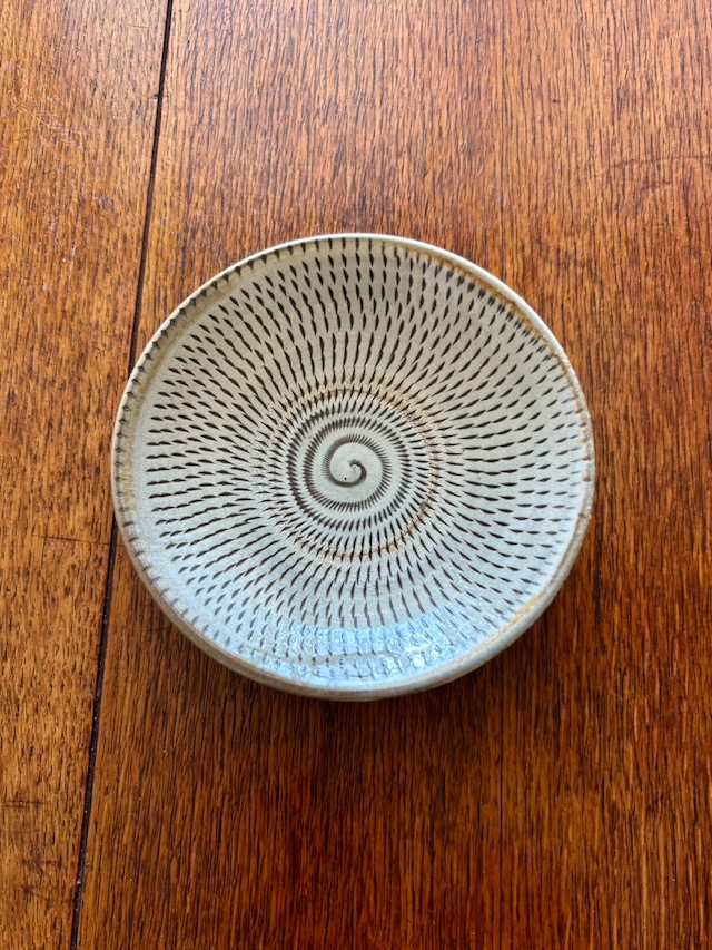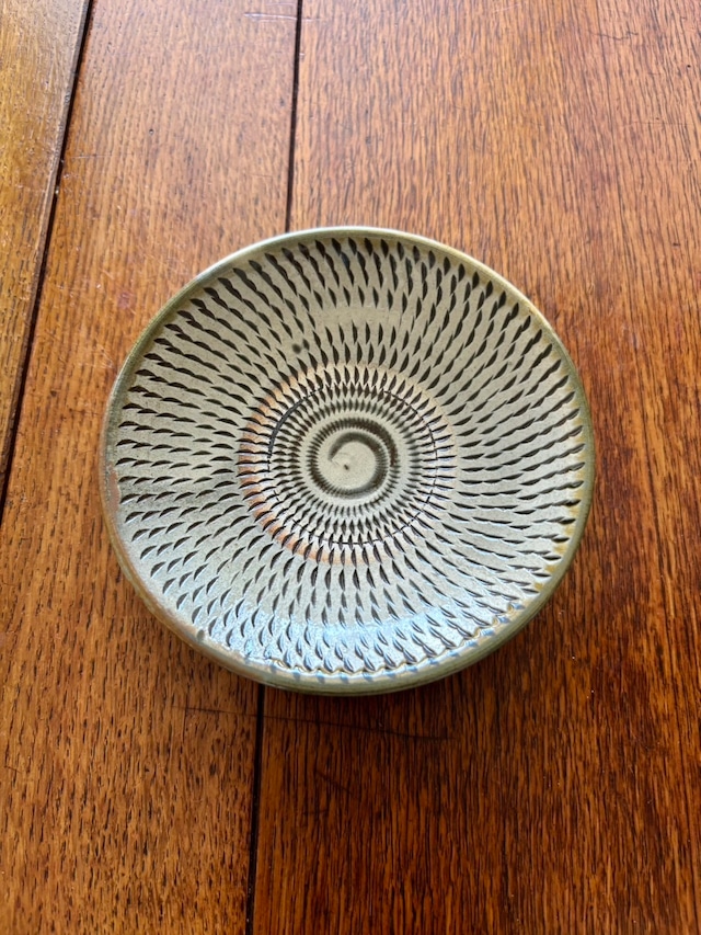 小鹿田焼 大分 飛び鉋 小皿 グレー 黄 緑 民藝 手仕事 b|Onta ware, Oita, Tobikannna, Small Plate, Grey, Yellow, Green, Folk Art, Handmade b 手作りの小鹿田焼は一つ一つ色や大きさ表情が違っていて魅力的です。 お料理の取り皿としてちょうど良い大きさのお皿です。和菓子や洋菓子などスイーツやフルーツを盛り付けるのもよいとおもいます。 小鹿田焼は、桃山時代(16 世紀末)に渡来した朝鮮人陶工によって伝えられ、 小石原窯(現 福岡県朝倉郡東峰村)を経て、現在の大分県日田市大字鶴河内字皿山に伝えられたものと言われています。開窯から300有余年、当時からの技法を受け継ぎ窯を守ってきています。小鹿田焼の里では、現在9軒の窯元が家族労働のみで作陶を行い、江戸時代から変わらぬ伝統的技法と伝統を守り続けています。小鹿田焼は、平成7(1995)年に国の重要無形文化財に指定されました。 飛び鉋は、火バサミや時計のぜんまいなどの金属を利用して、職人さんが使いやすいように自作した鉋を、蹴ろくろで回転させている陶器の表面にあてて、その反動で連続的に削り目を入れて模様を刻む技法です。 サイズ: a 白 黄 直径124mm、高さ30mm b グレー 黄 緑 直径127mm、高さ32mm c 緑 黄 直径122mm、高さ31mm Each handmade Onta ware is charmingly unique in its color, size, and expression. These plates are just the right size for serving food. They are also great for serving sweets, such as Japanese and Western confectioneries, or fruit. Onta ware was introduced by Korean potters who came to Japan during the Momoyama period (late 16th century), and is said to have passed on from Koishiwara Kiln (present-day Toho Village, Asakura County, Fukuoka Prefecture) to what is now Sarayama, Tsurukawachi, Hita City, Oita Prefecture. Over 300 years after its opening, the techniques from that time have been passed down and the kiln has been preserved. In the village of Onta ware, nine potteries currently produce pottery using only family labor, preserving the traditional techniques and traditions that have remained unchanged since the Edo period. Onta ware was designated an Important Intangible Cultural Property of Japan in 1995. Tobikanna is a technique in which a plane, which the craftsman has made himself using metals such as fire tongs or clock springs to make it easier to use, is placed against the surface of pottery that is being rotated on a kick wheel, and the recoil of the plane continuously carves marks to carve a pattern. Sizes: a White/Yellow: Diameter 124mm, Height 30mm b Gray/Yellow/Green: Diameter 127mm, Height 32mm c Green/Yellow: Diameter 122mm, Height 31mm