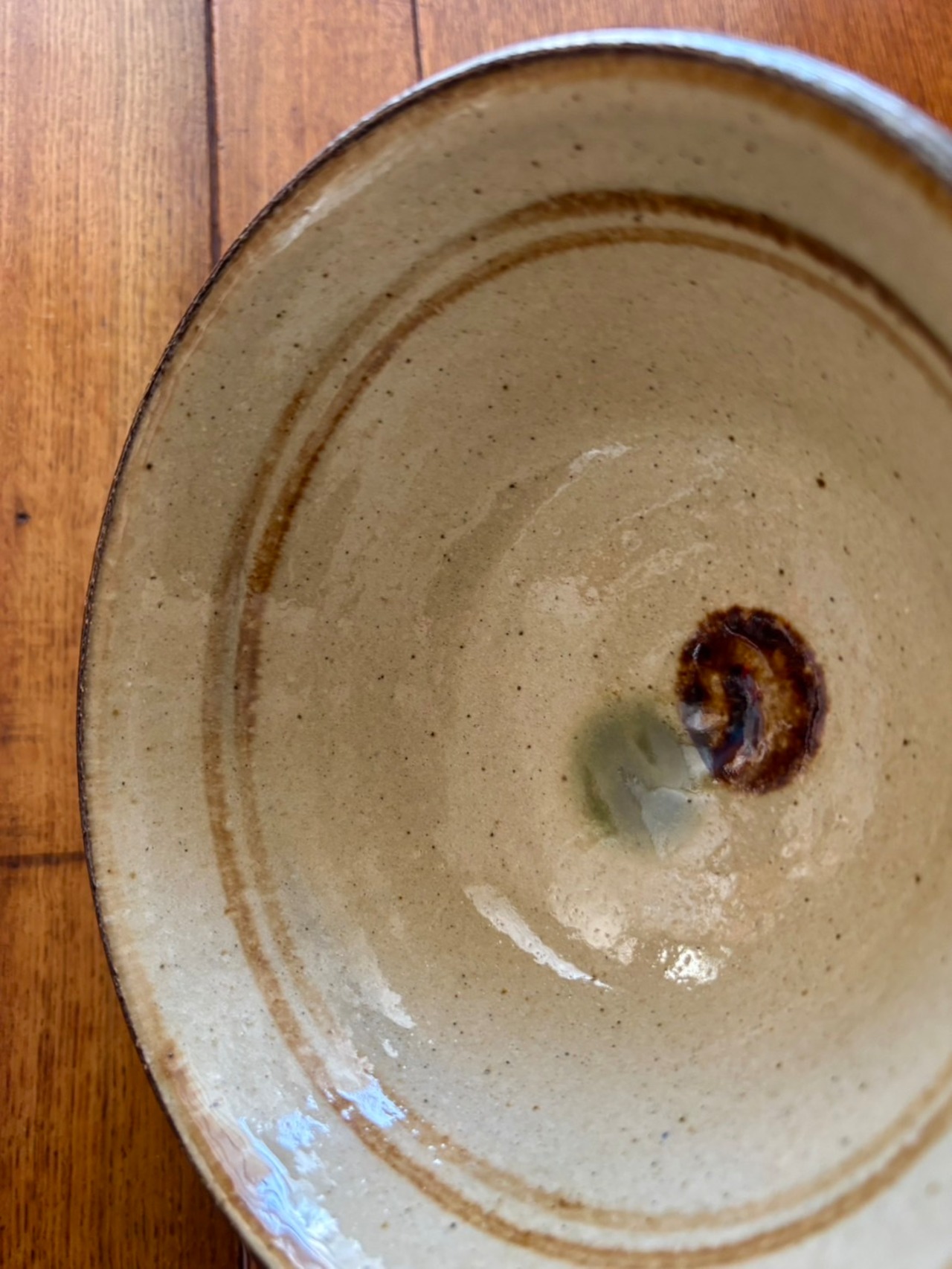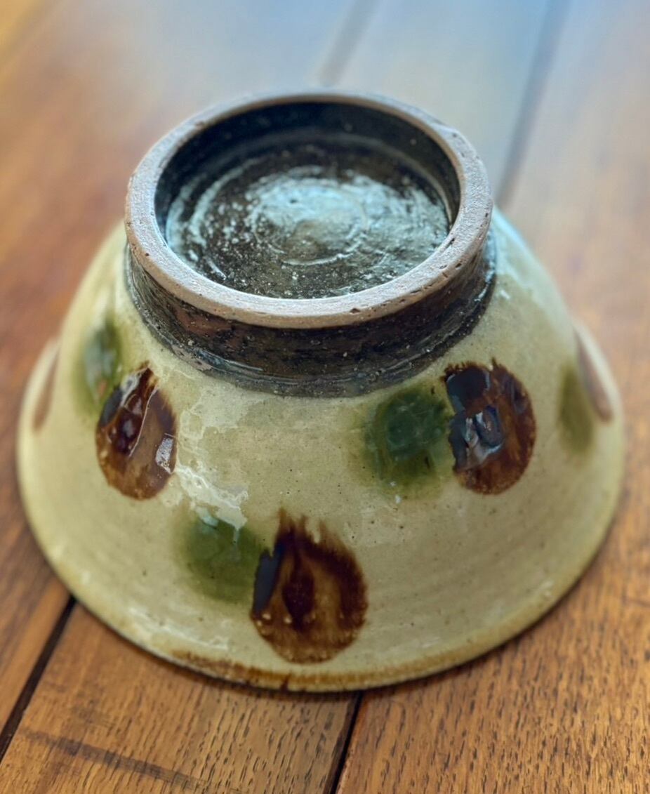 The distinctive base and the shape of the rim are impressive. The green and brown dot pattern also has a simple taste. The bowl is thick and fits comfortably in your hand, just like Yachimun, making it easy to use. Soki soba eaten in a soba makai like this is sure to be delicious.