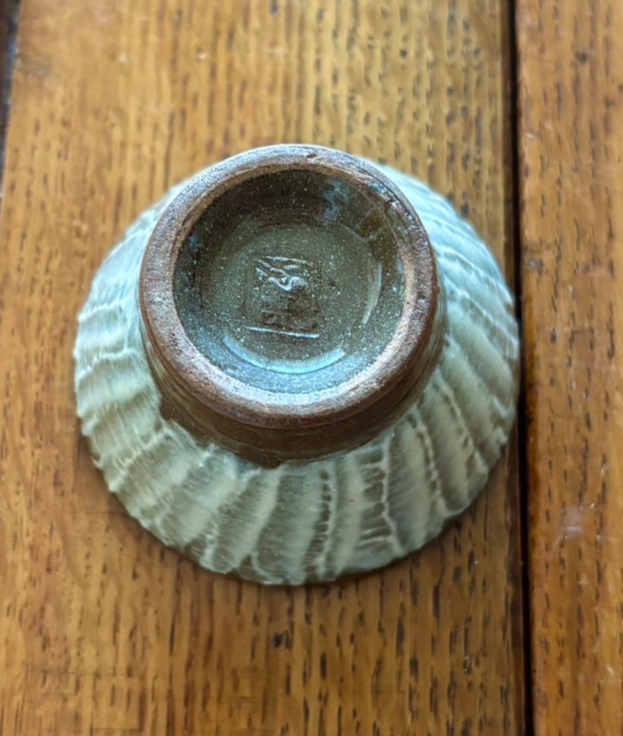 内側は線彫りによる魚文、外側は鎬のような装飾仕上げです。