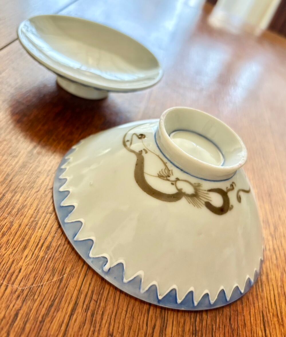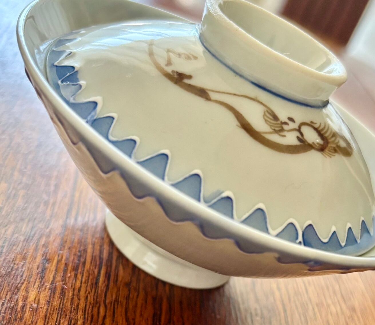 蓋付きの染付の茶碗。茶碗と蓋のふちに見られるブルーと白盛りの波打つようなデザインがとてもモダンで魅力的です。他にあまり見られない大胆なデザイン。器の高台まわりの茶色の絵付けはおそらく龍なのでしょう。波打つ海原の上の空を飛翔する龍を表現しているようです。薄手で華奢な青みがかった生地、ブルーと白と茶の組み合わせもお洒落です。