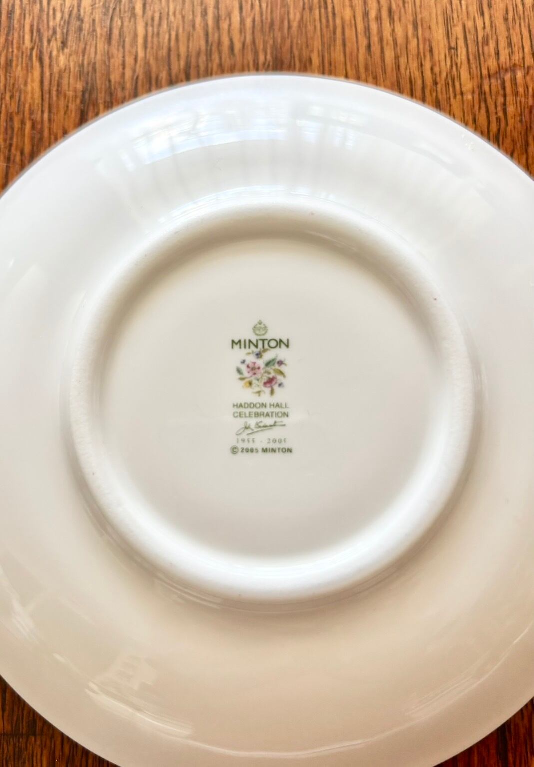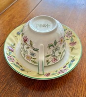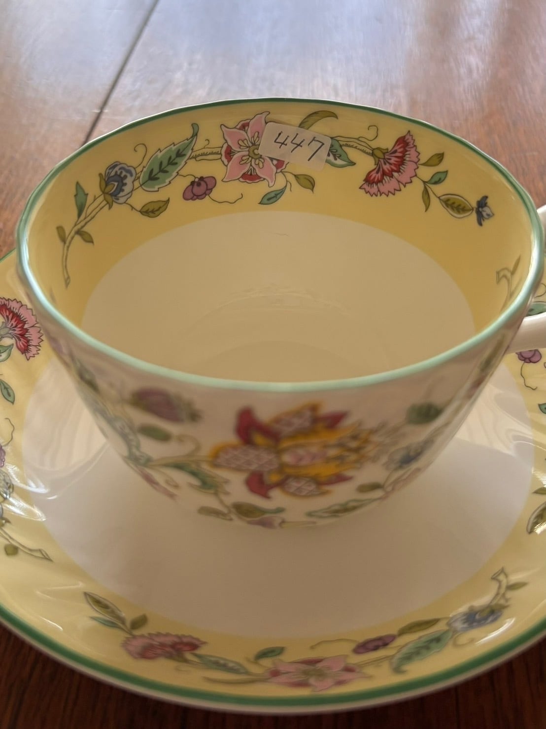 This C&S is part of the Haddon Hall Celebration series, created to commemorate the 50th anniversary of designer John Wadsworth's death. The cups and saucers feature colored bands around the edges. Available in four colors: green, blue, pink, and yellow, this is the yellow version.