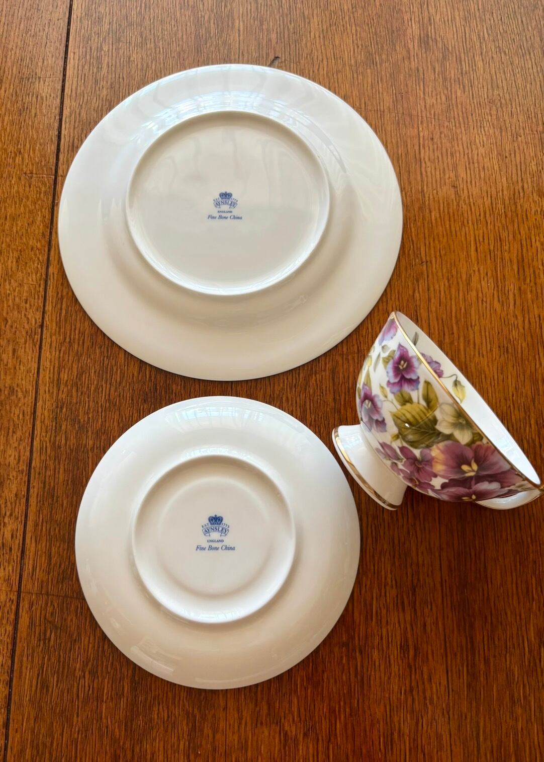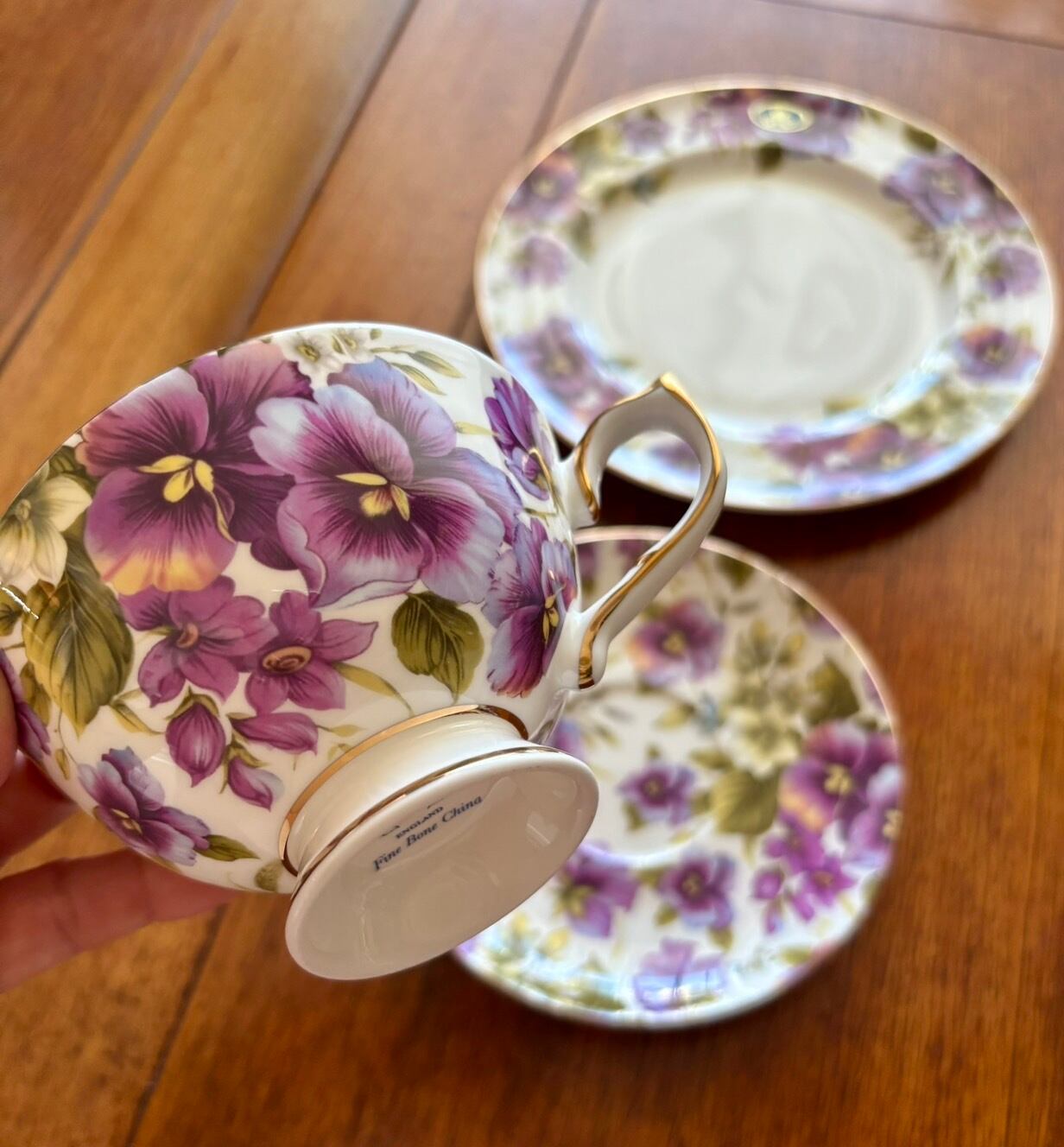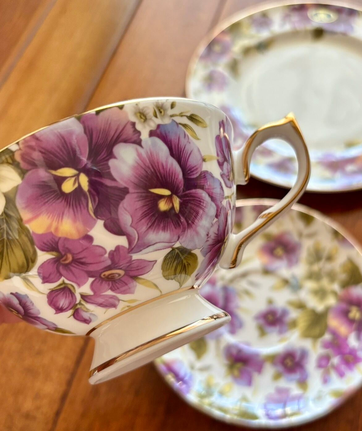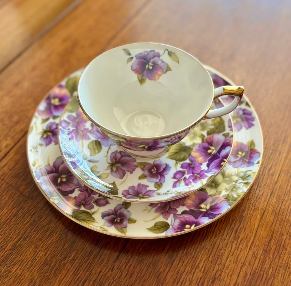 エインズレイ ステッチコール ワイルドパンジー スミレ トリオカップ&ソーサー ファインボーンチャイナ|Aynsley Stitch Call Wild Pansy Violet Trio Cup & Saucer Set in Fine Bone China