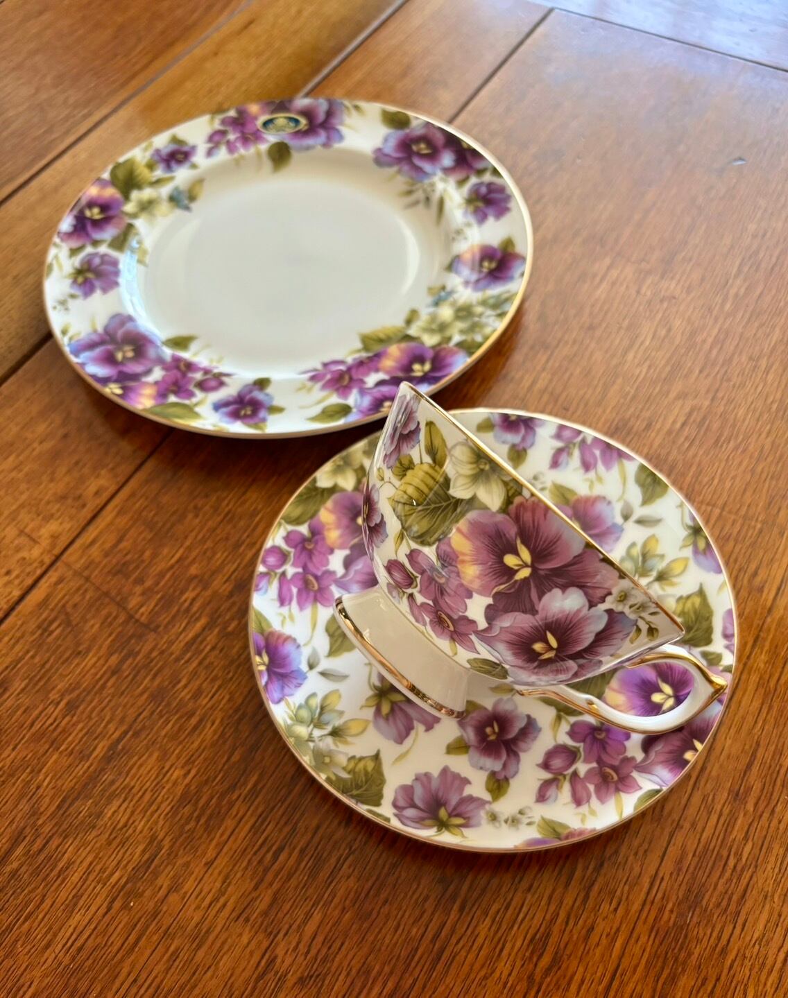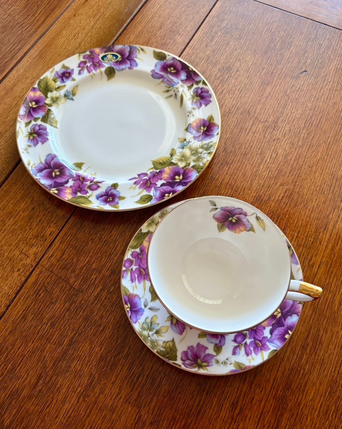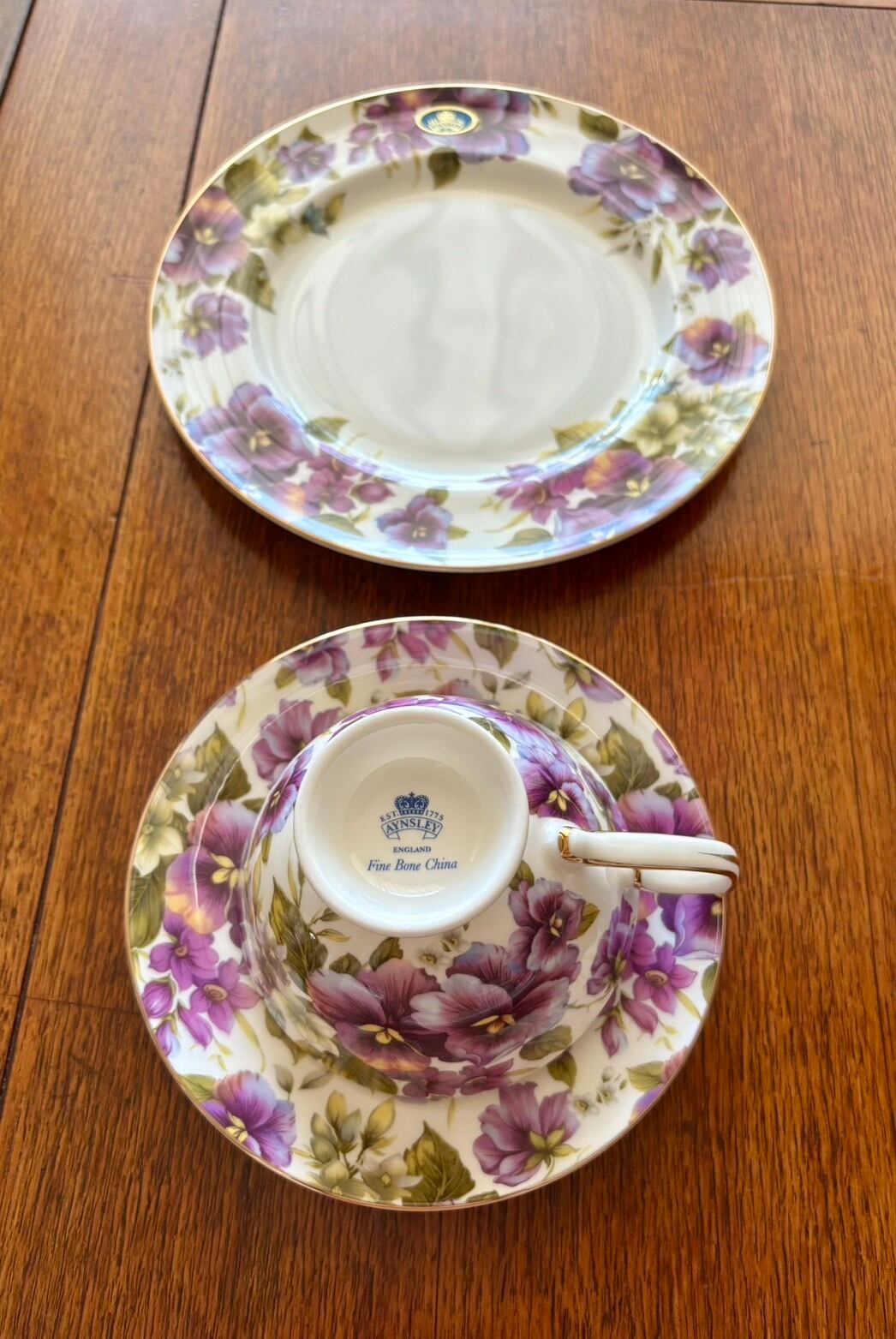 エインズレイ ステッチコール ワイルドパンジー スミレ トリオカップ&ソーサー ファインボーンチャイナ|Aynsley Stitch Call Wild Pansy Violet Trio Cup & Saucer Set in Fine Bone China