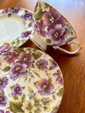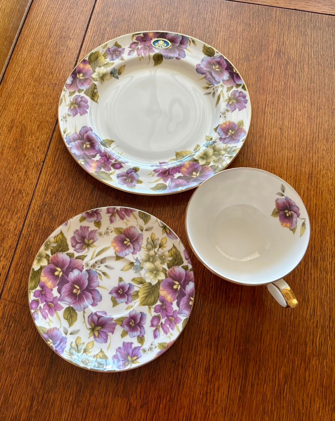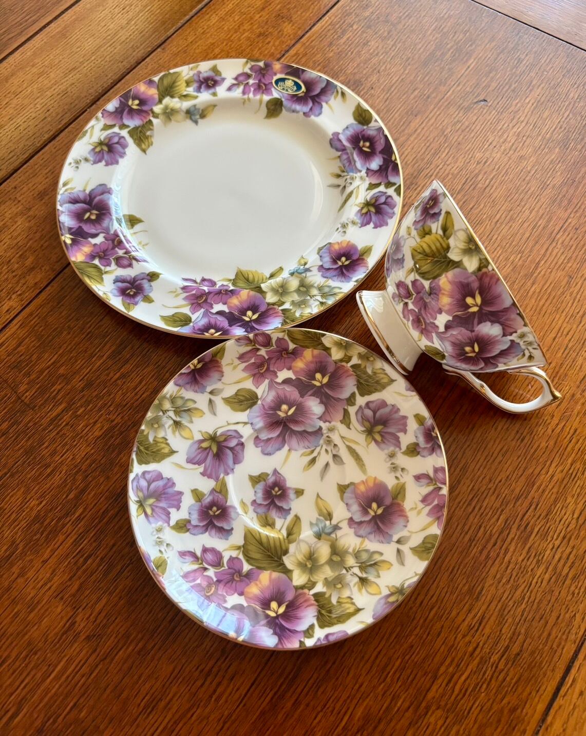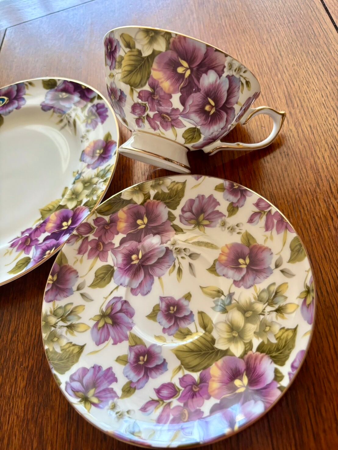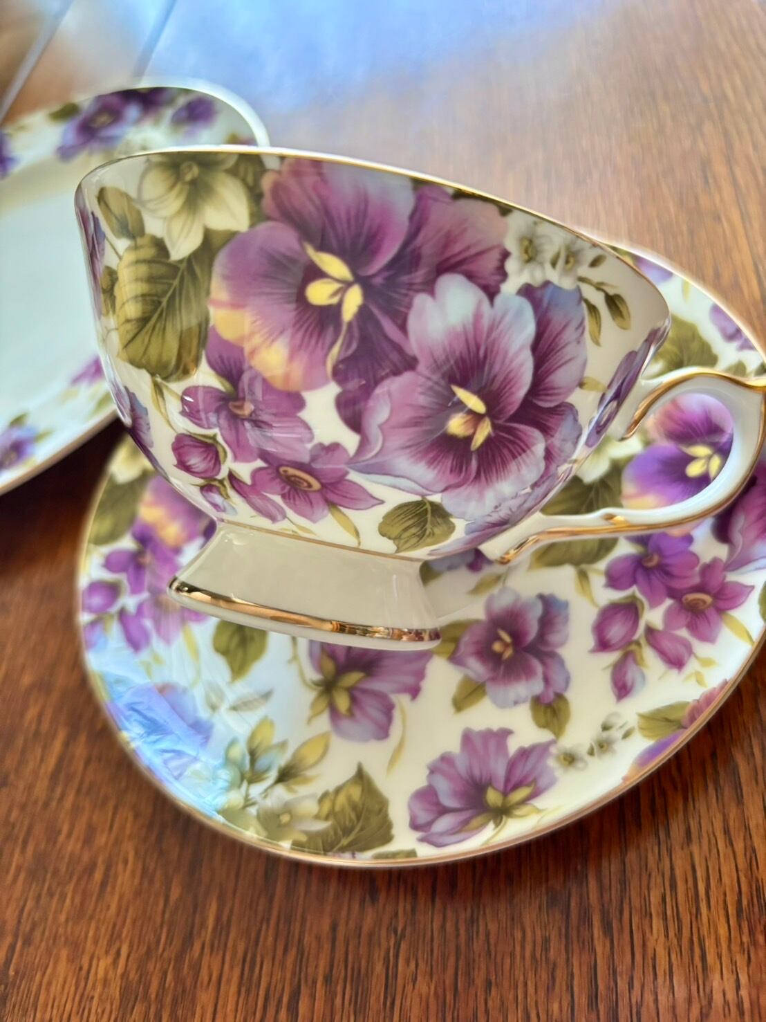 エインズレイ ステッチコール ワイルドパンジー スミレ トリオカップ&ソーサー ファインボーンチャイナ|Aynsley Stitch Call Wild Pansy Violet Trio Cup & Saucer Set in Fine Bone China
