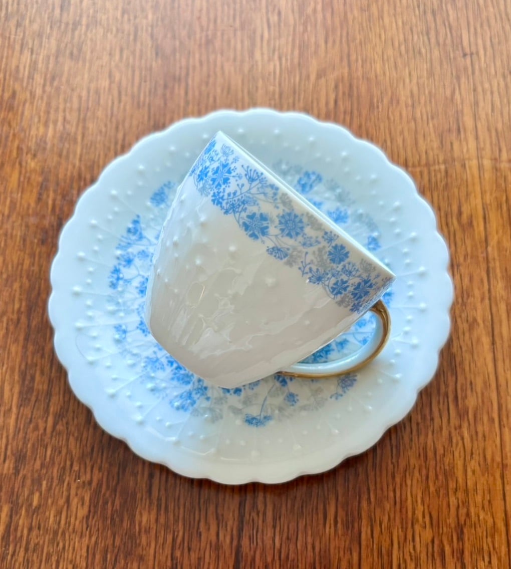 薄く透き通るようなボーンチャイナに、ツブツブが特徴の繊細なレリーフに可憐なリヴィエラの花が描かれています。
