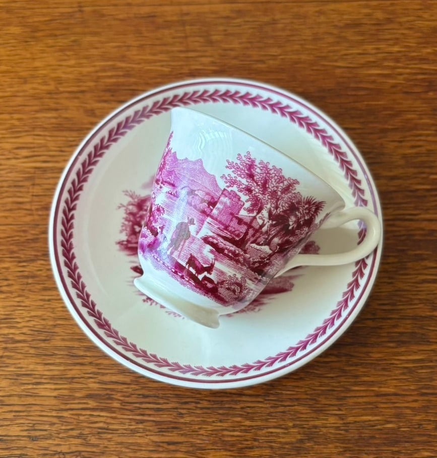 This is a mulberry demitasse cup and saucer made at Wedgwood's Etruria factory. It has a very eye-catching design, with flower petal decorations on the edges and rim and a landscape motif in the center.