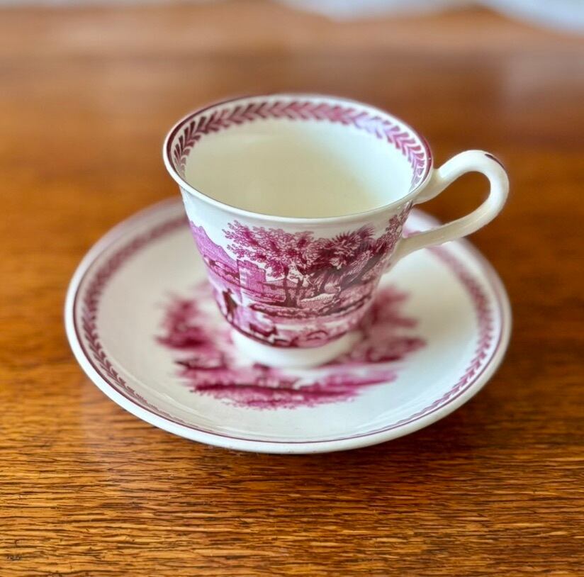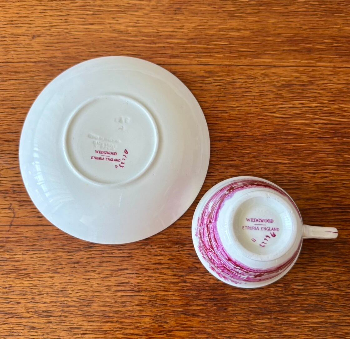 ウェッジウッドのエトルリア工場で製作されたマルベリーのデミタスカップ&ソーサーになります。とても目を惹くデザインです。花びらの装飾がエッジとリムにあしらわれていて、中央には風景が描かれています。