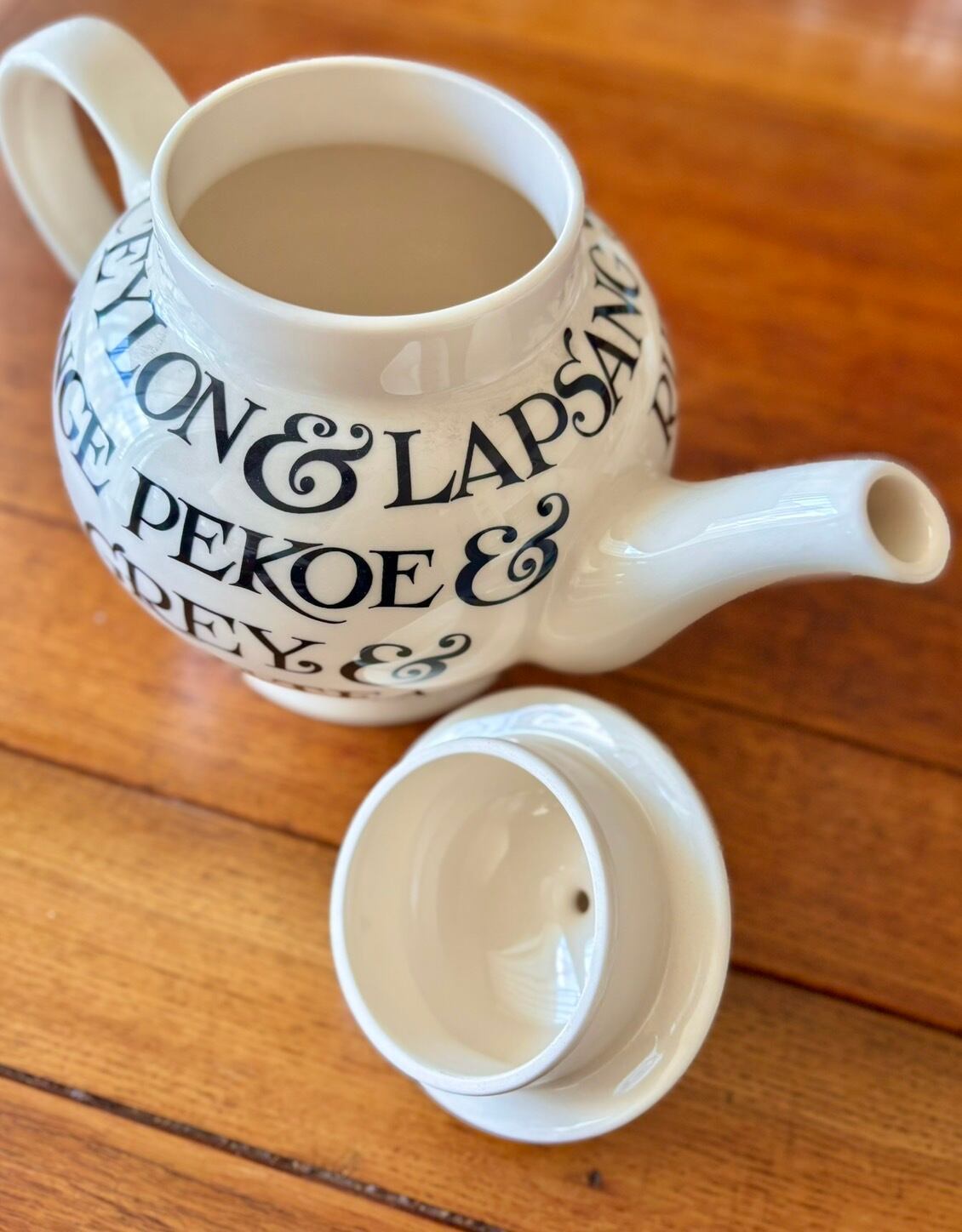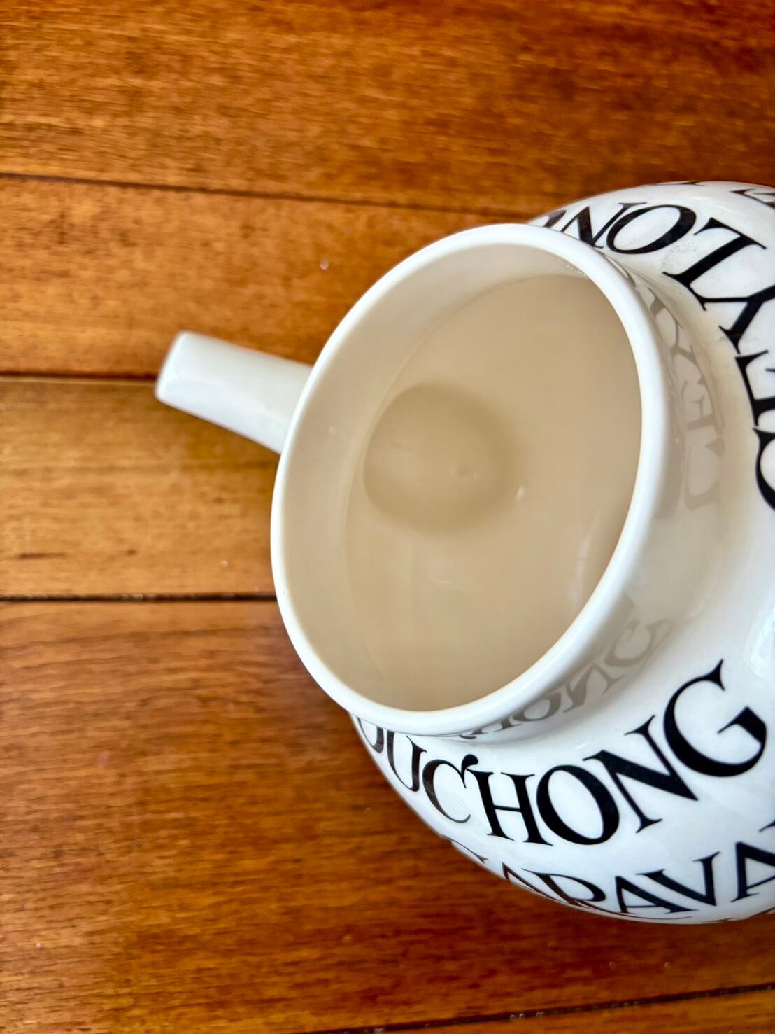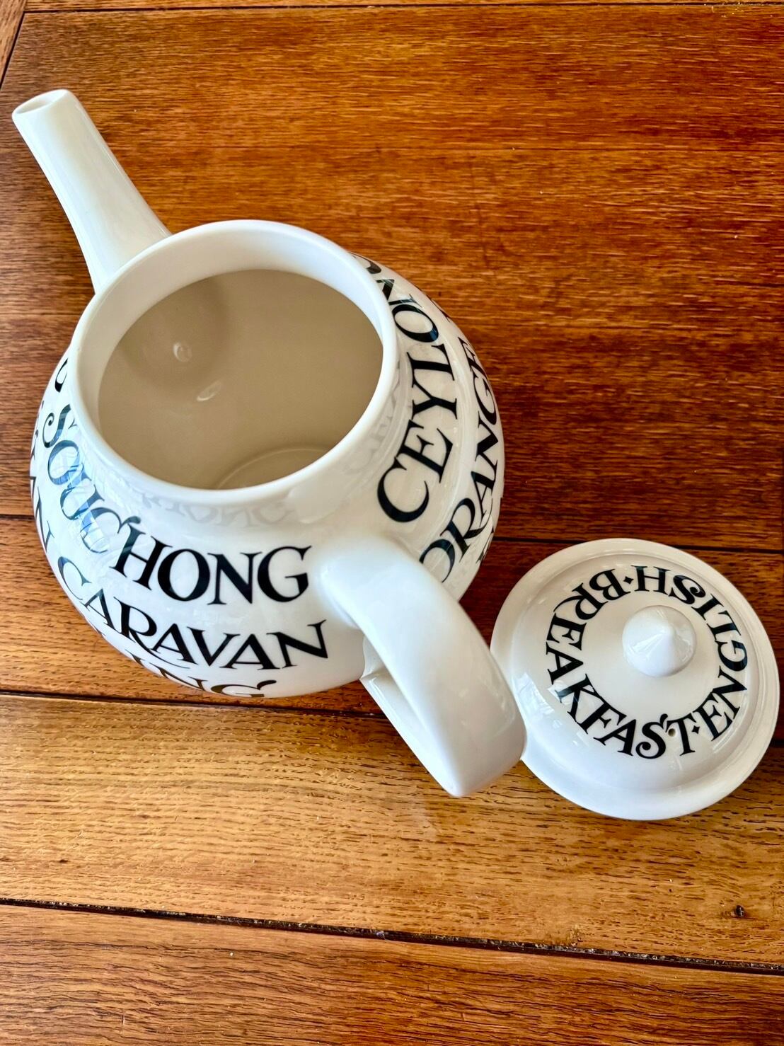 This teapot features the popular Black Toast design from British ceramics brand Emma Bridgewater. Its charming hand-painted design embodies the desire to combine beauty and functionality, creating a moderately substantial vessel perfect for everyday use. The lid knob is easy to grip, and the handle shape fits comfortably in the hand.