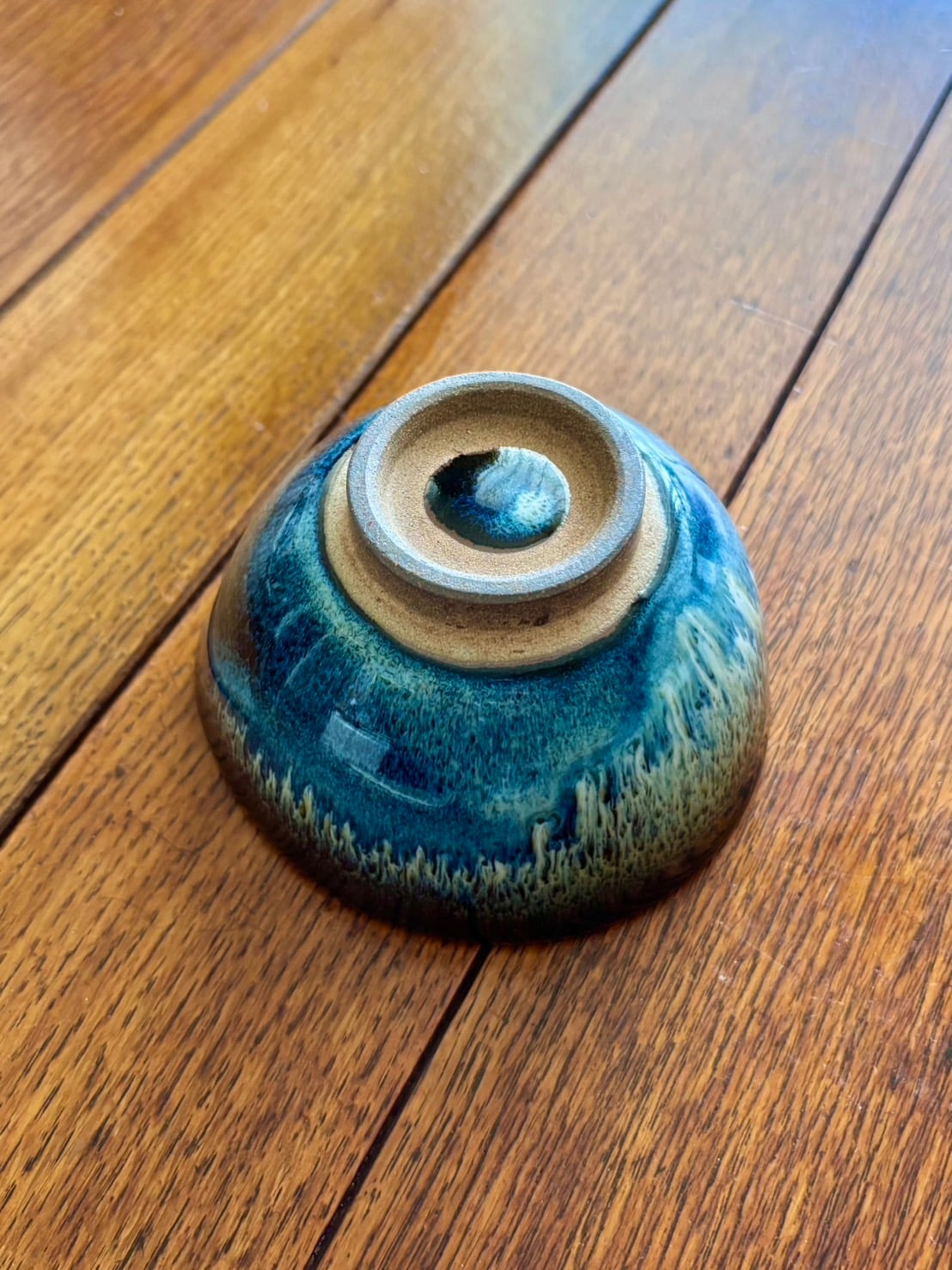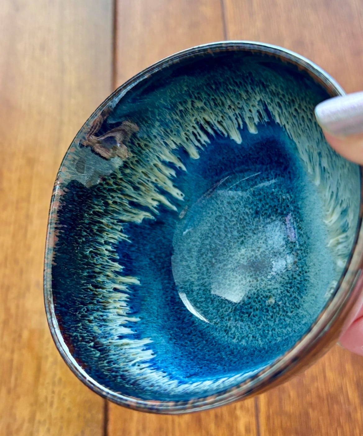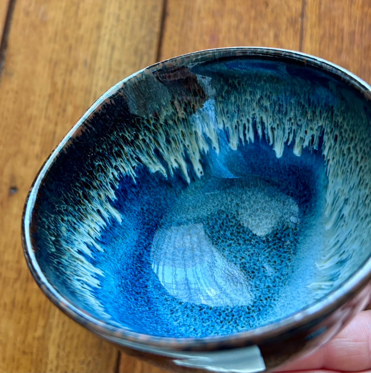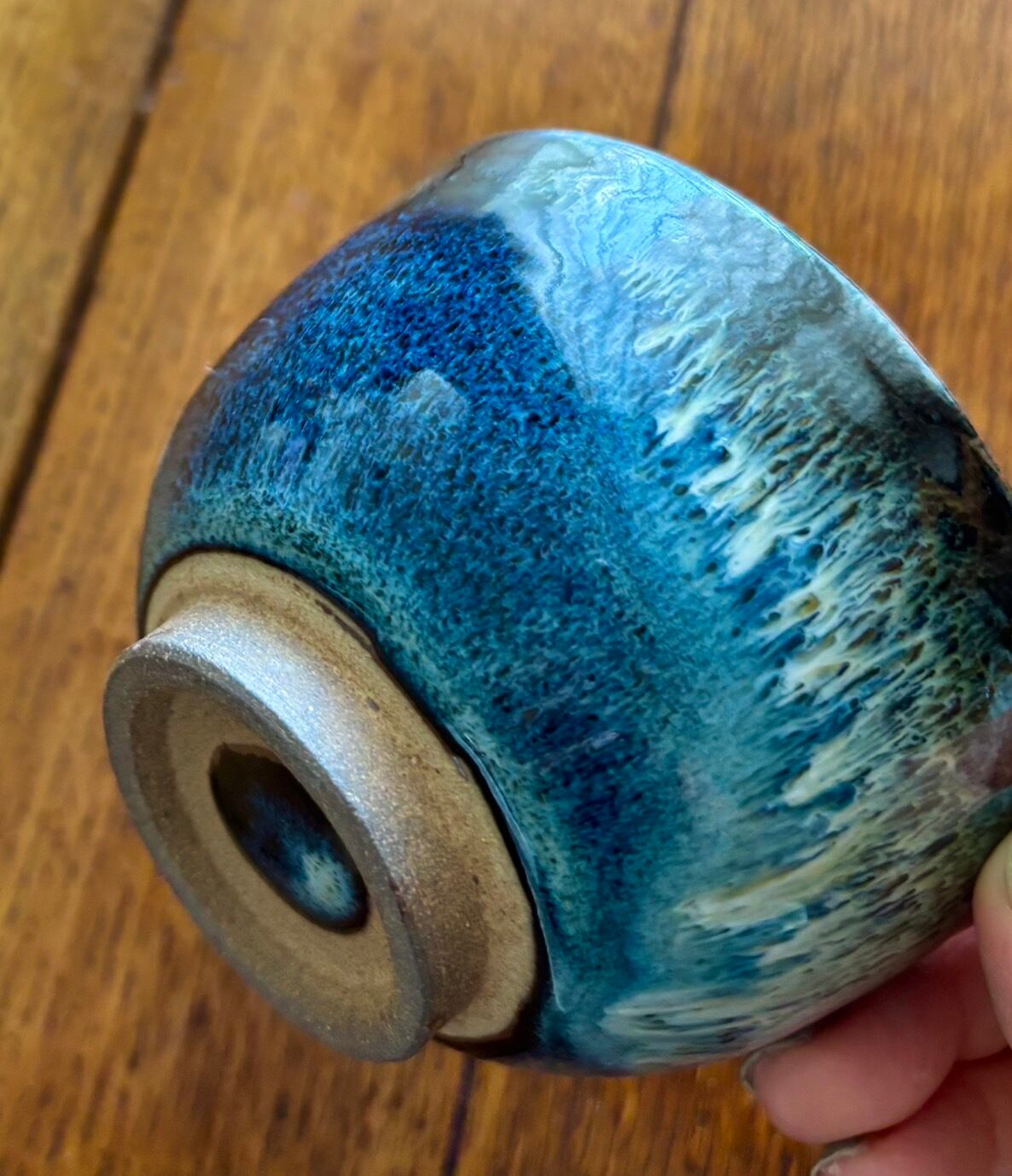It features a cute, round shape and a deep blue and white glaze. The white glaze flows like an aurora over the deep blue glaze, reminiscent of the night sky, evoking the feeling of a magnificent expanse of the night sky. Enjoying the rich and varied expressions of the glaze is sure to be a delicious drink. It also makes a great small bowl for serving food, which stands out against the blue.