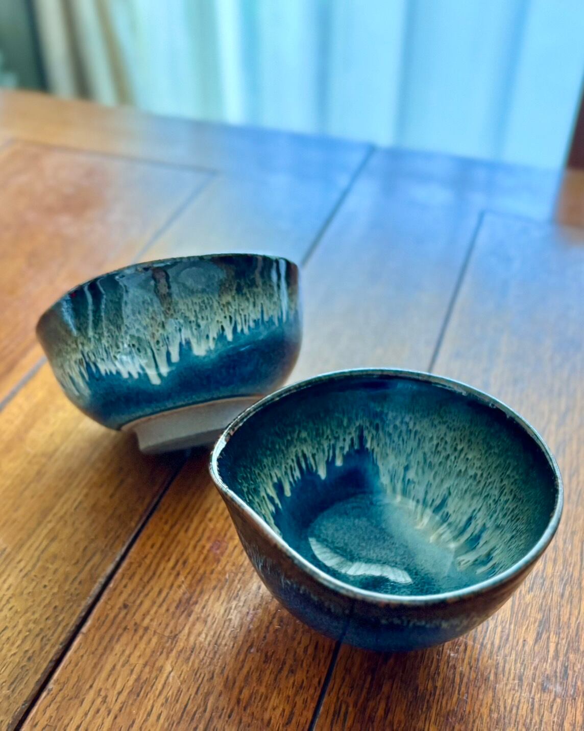 ころんと丸い可愛らしいフォルムと深い青と白の釉薬が特徴です。夜の空のような深い青釉の上をオーロラのように流れ落ちる白い釉薬が、壮大な夜空の広がりを感じさせます。豊かで多彩な表情を楽しみながら飲むお酒はきっと美味しいでしょう。青に映えるお料理を盛り付ける小鉢としても活躍してくれるでしょう。
