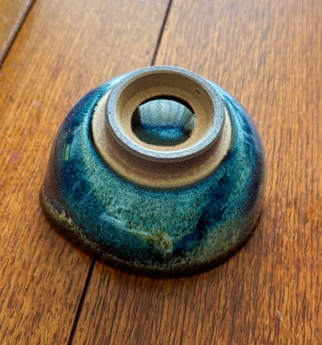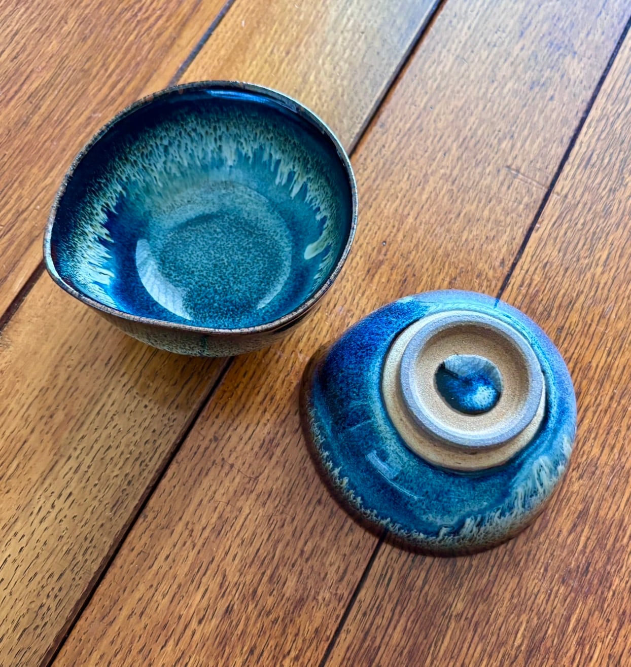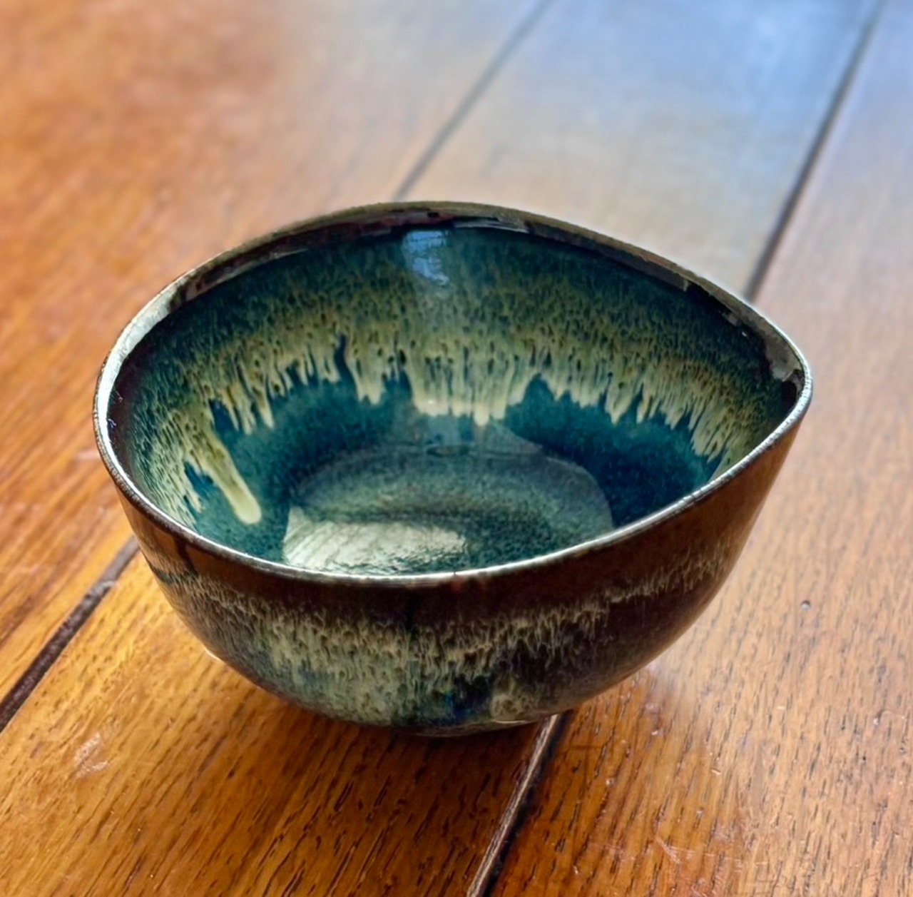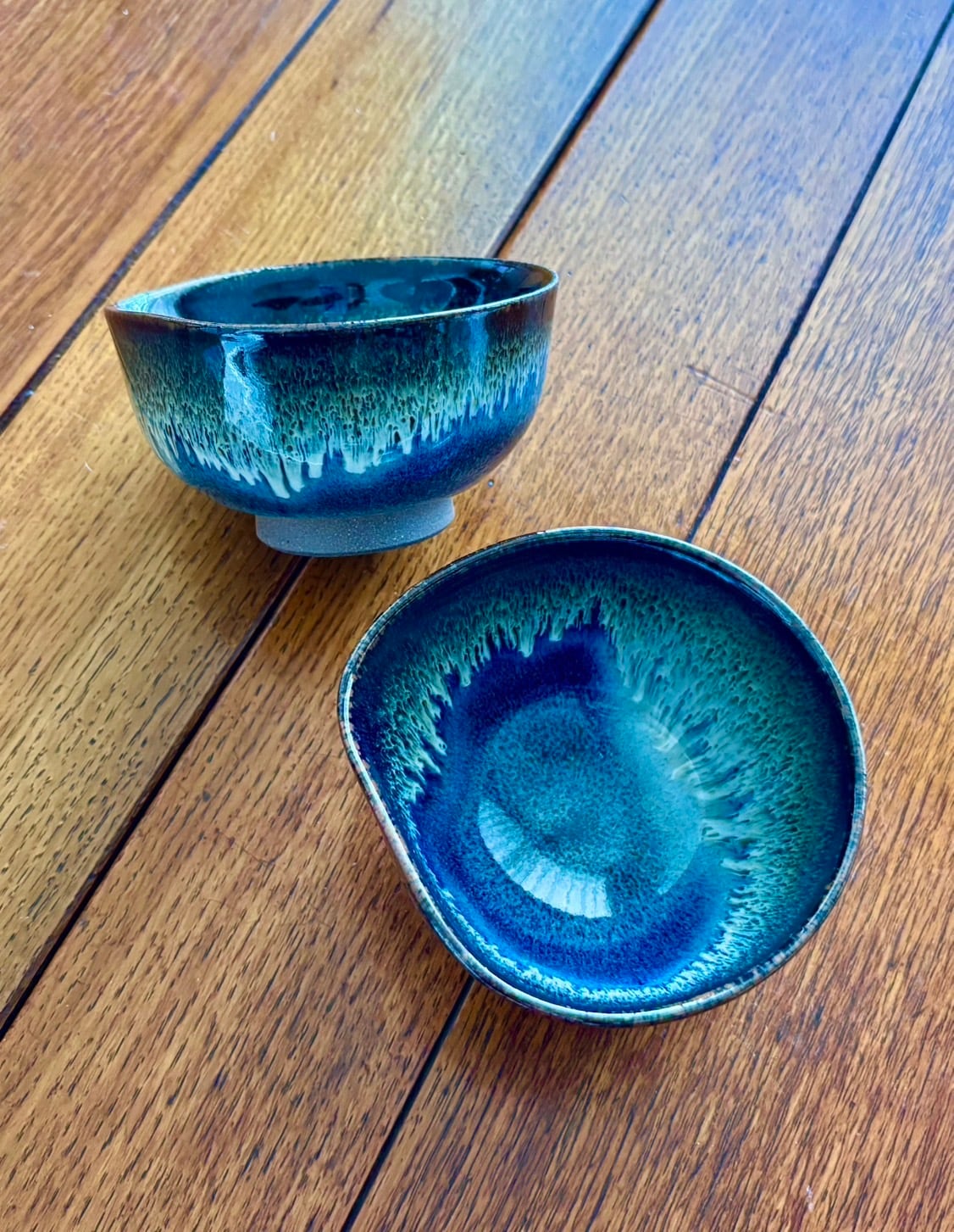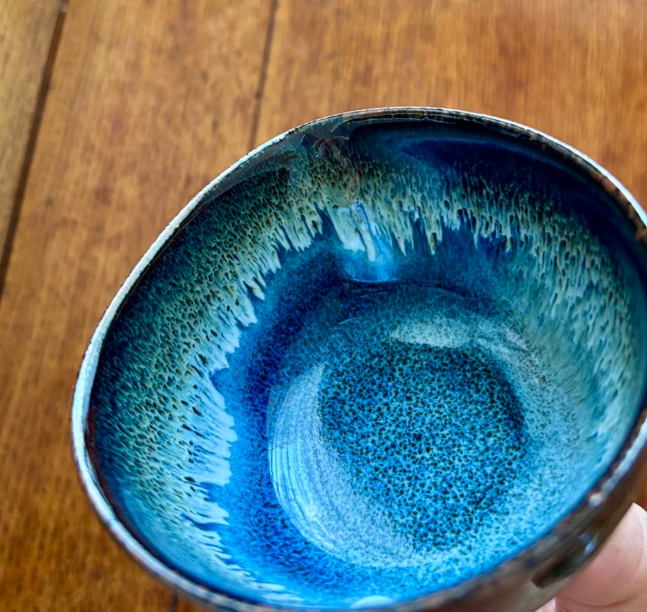 ころんと丸い可愛らしいフォルムと深い青と白の釉薬が特徴です。夜の空のような深い青釉の上をオーロラのように流れ落ちる白い釉薬が、壮大な夜空の広がりを感じさせます。豊かで多彩な表情を楽しみながら飲むお酒はきっと美味しいでしょう。青に映えるお料理を盛り付ける小鉢としても活躍してくれるでしょう。