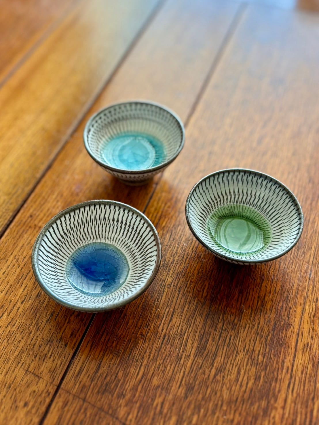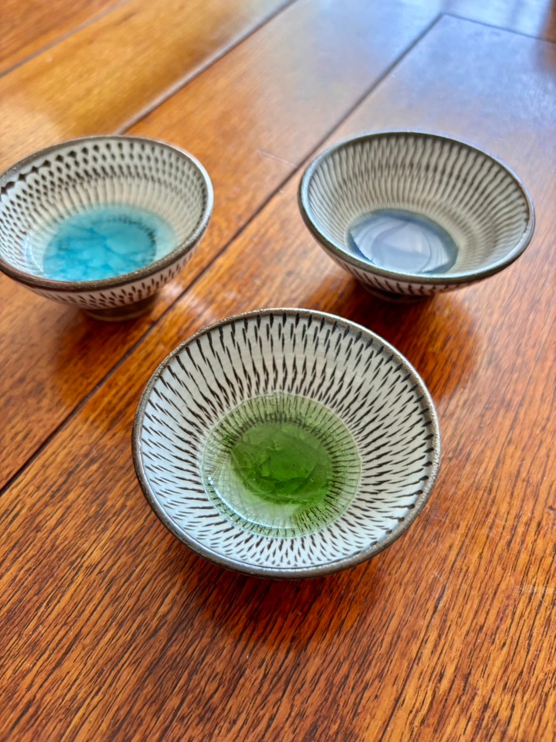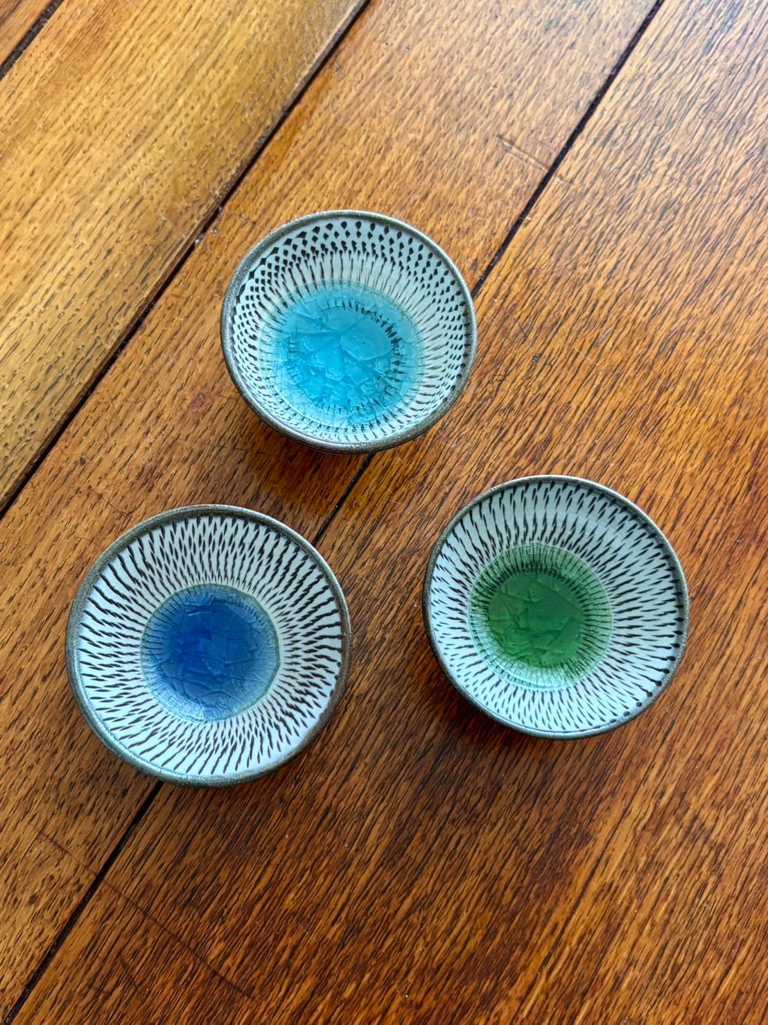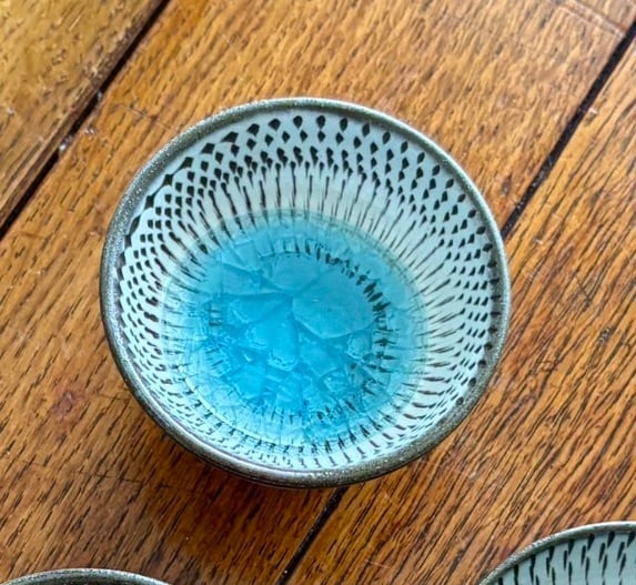 飛び鉋と中央の色ガラスの貫入が美しいぐい呑み 豆皿です。