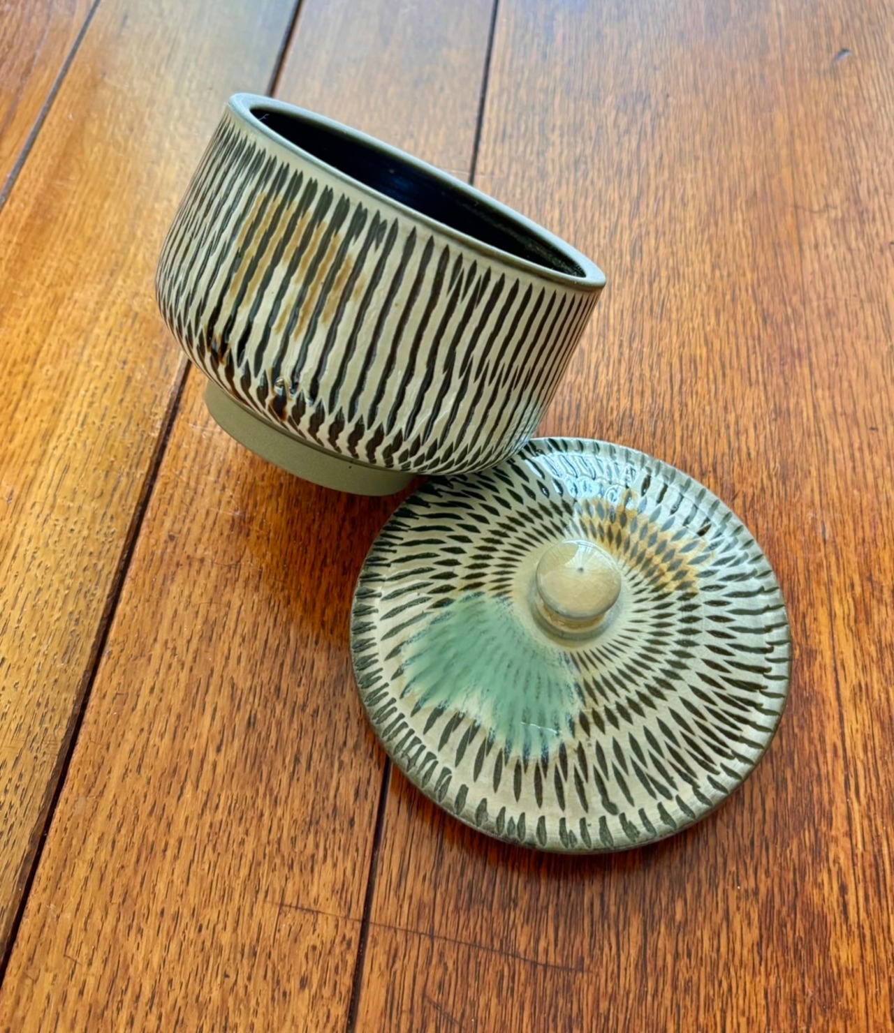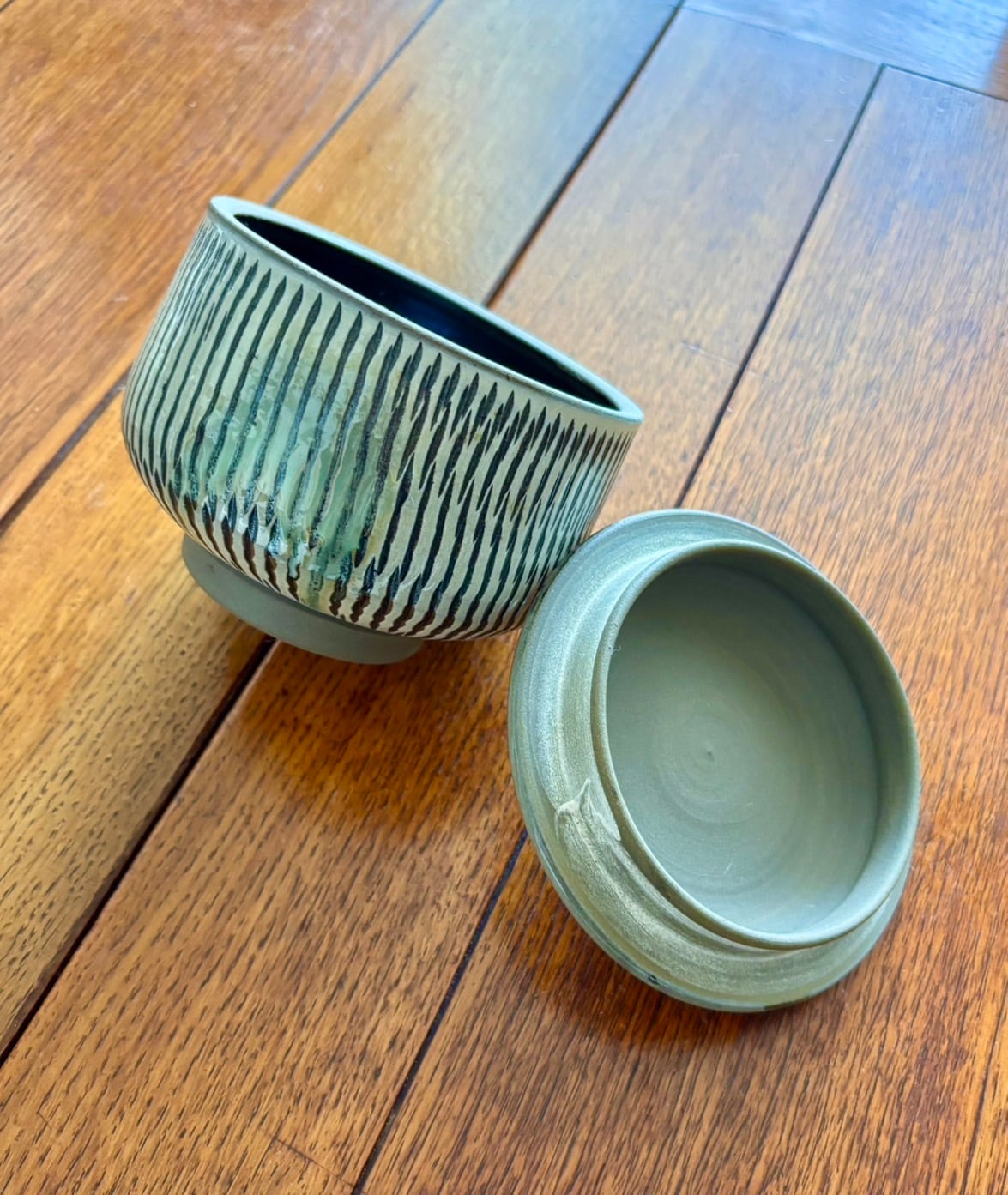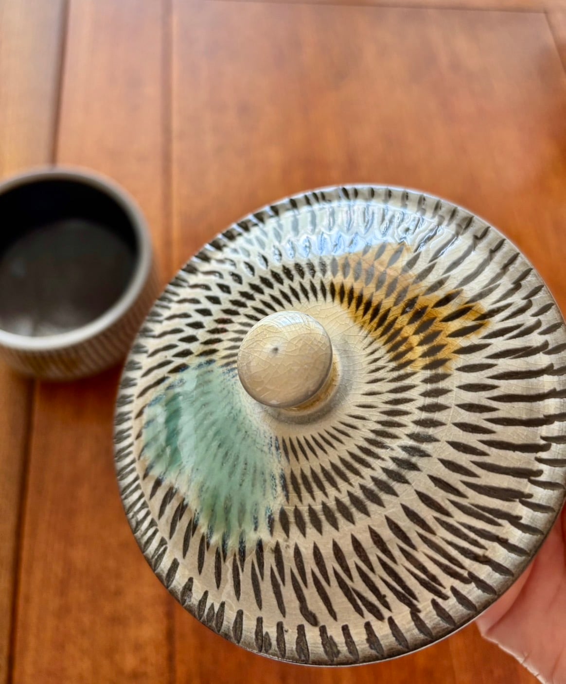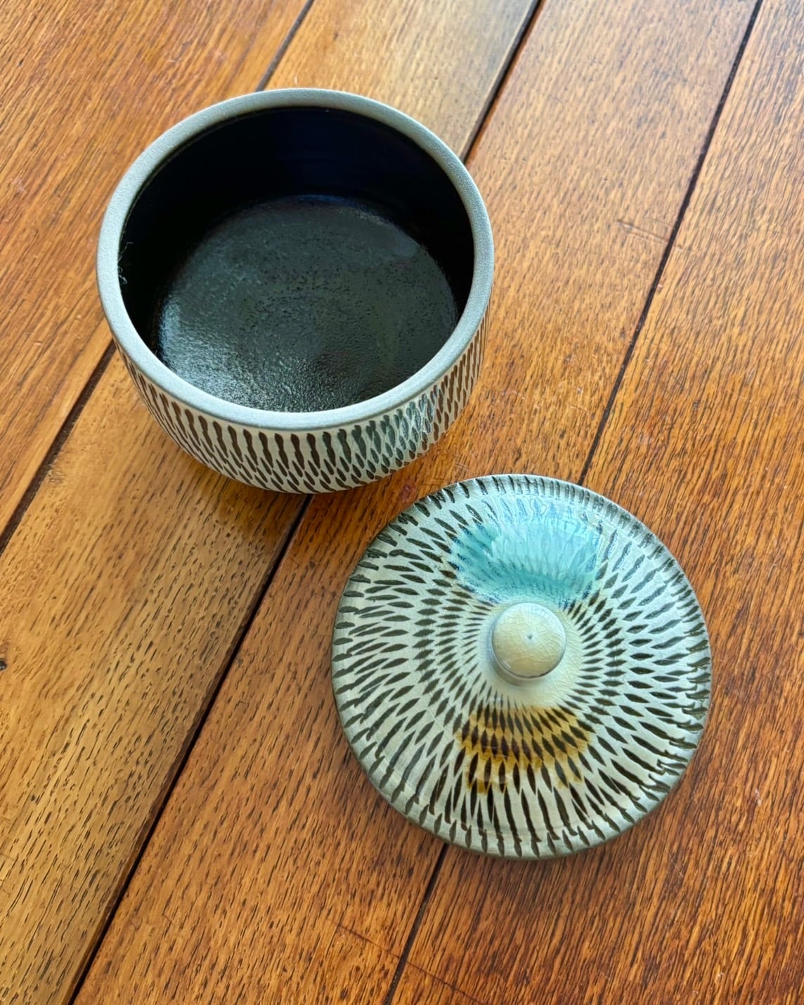 手作りの飛び鉋が美しい蓋付きの小物入れ。