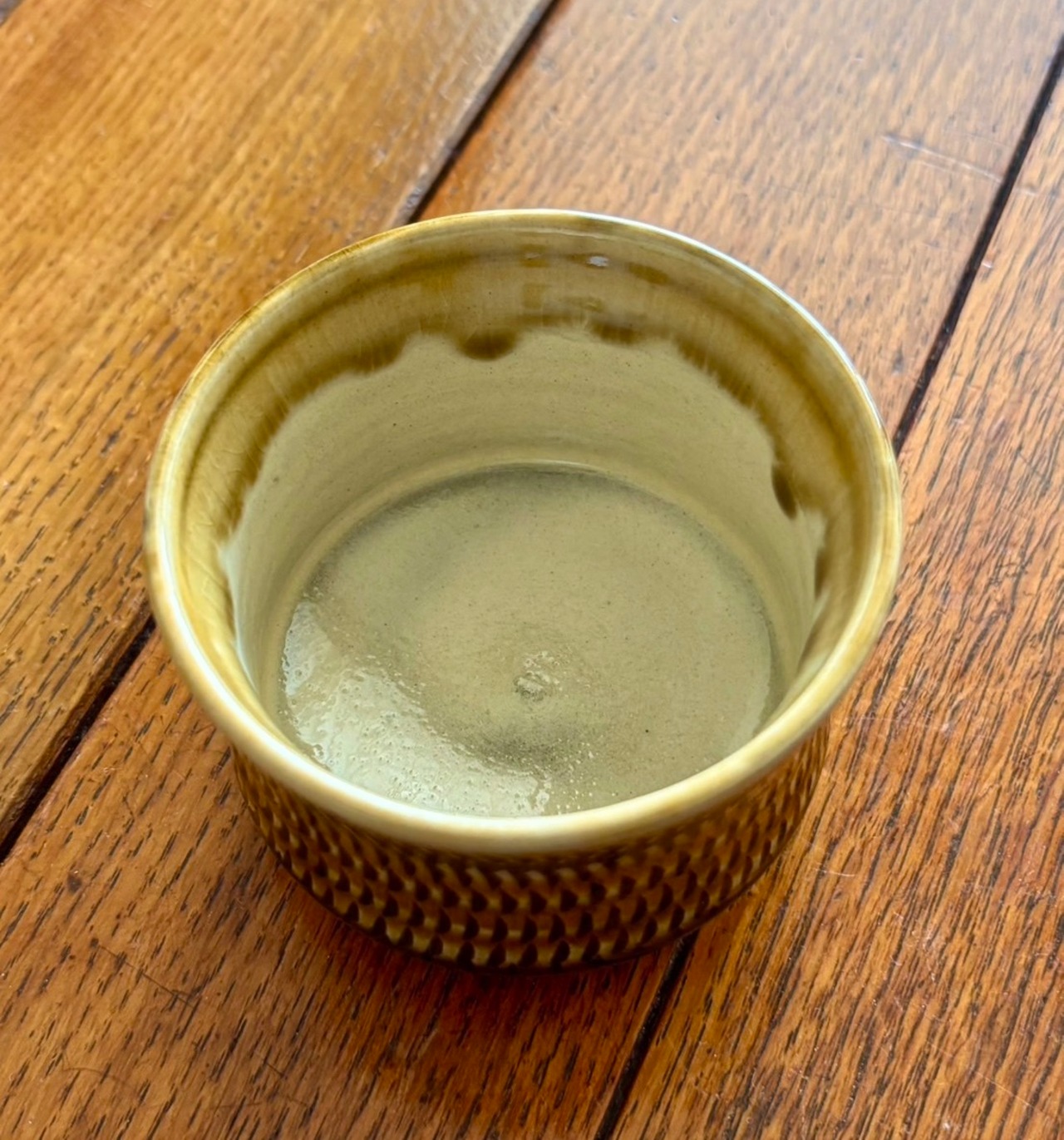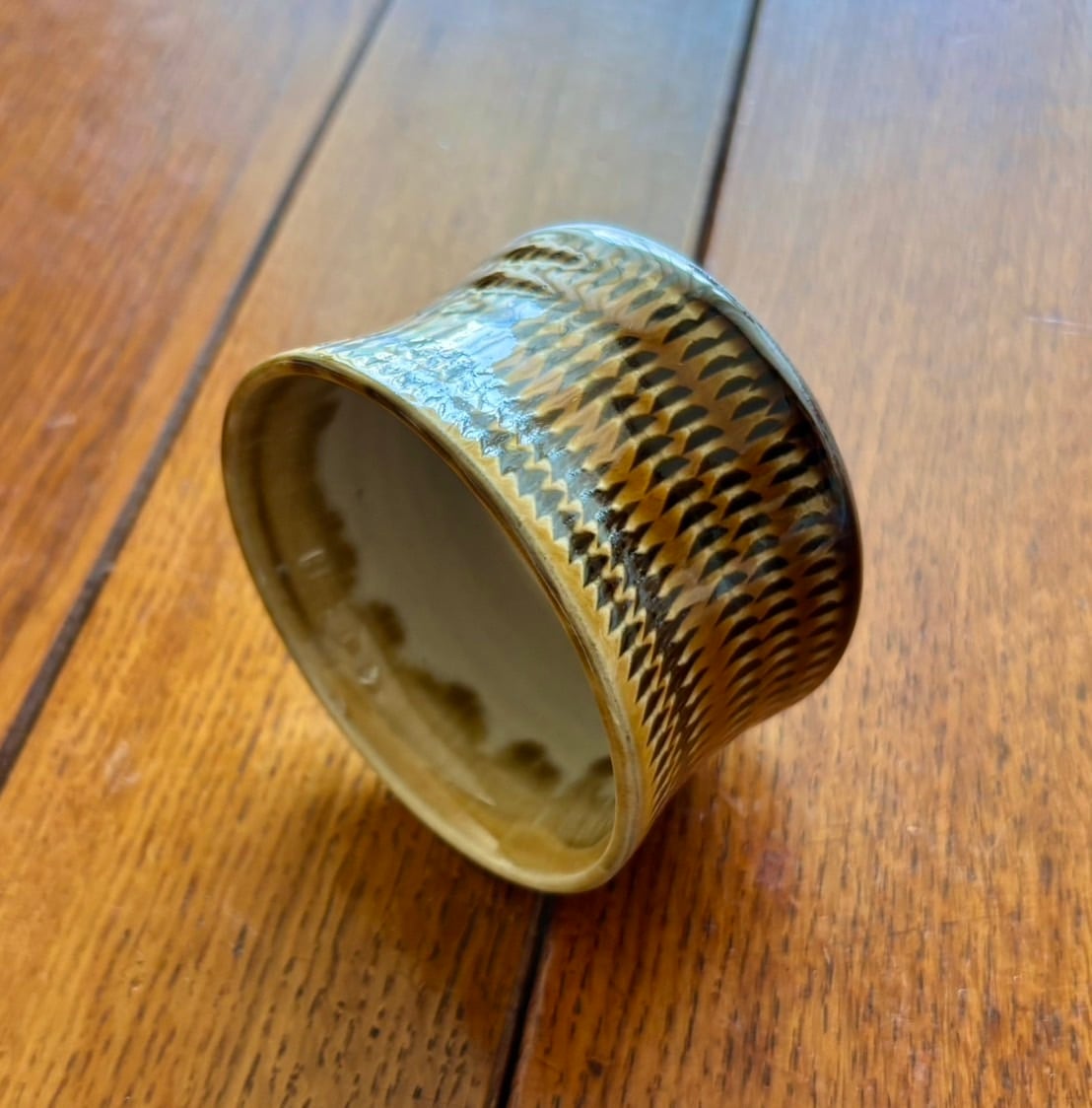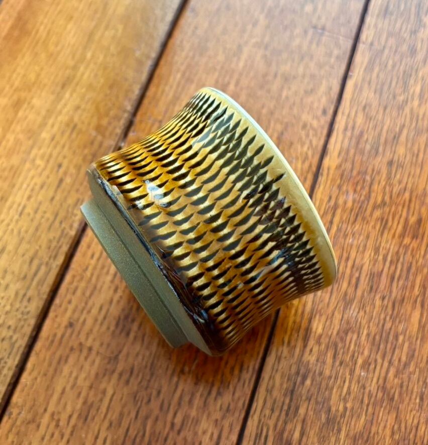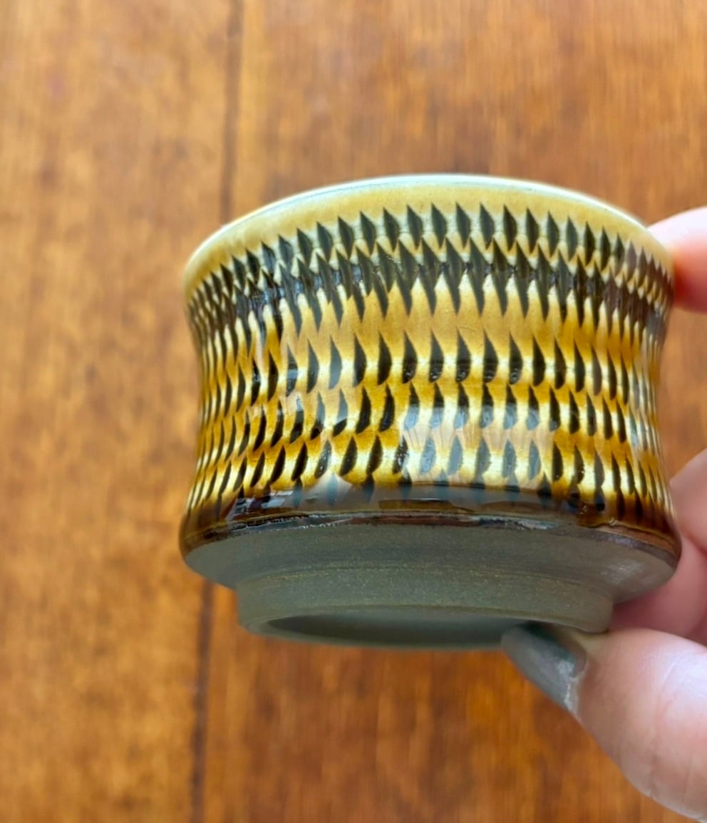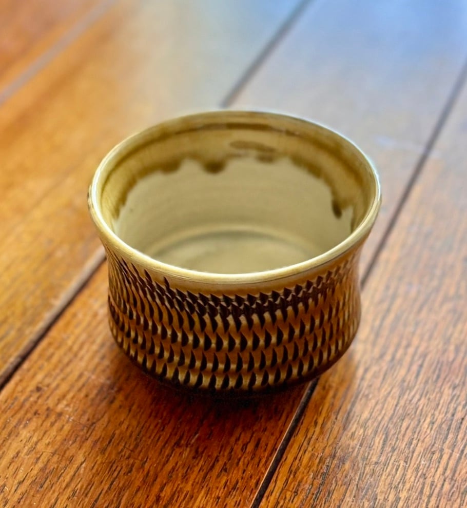 飛び鉋の模様と黄色や飴色の釉薬が美しい手作りのぐい呑み。