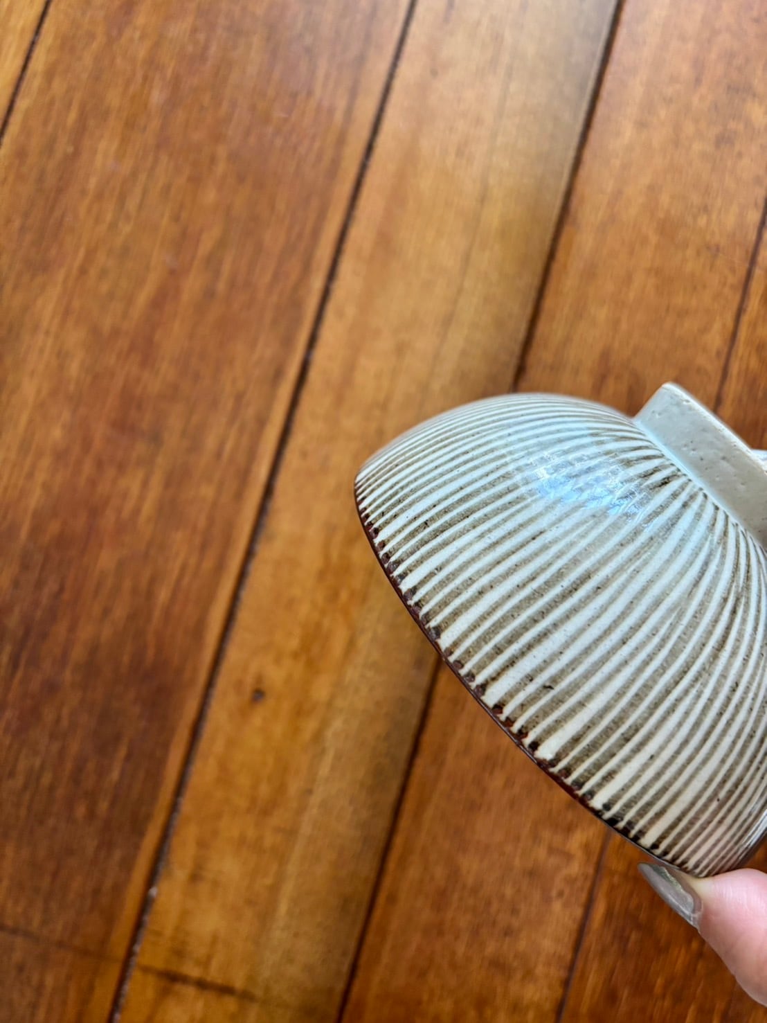 朱色と錆色のフリーハンドで引かれた十草模様は、手書きならでは温もりがあって魅力的な茶碗です。内側の白化粧もとても綺麗です。