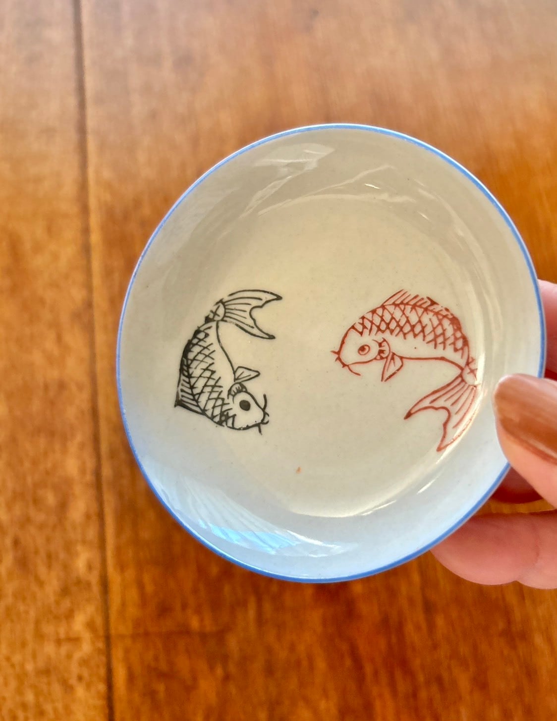 This adorable small plate features a red and black carp design.