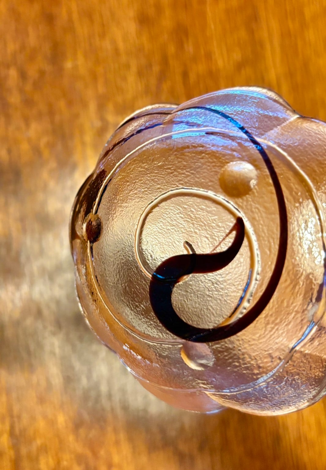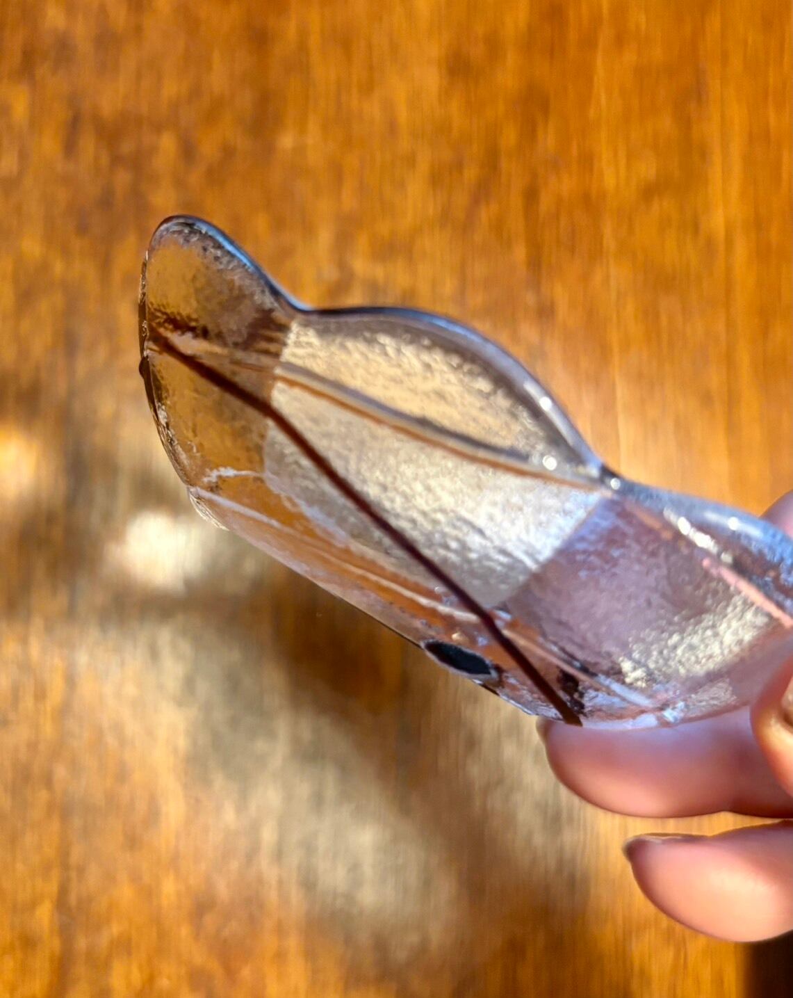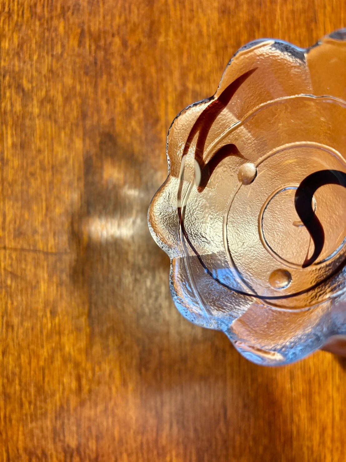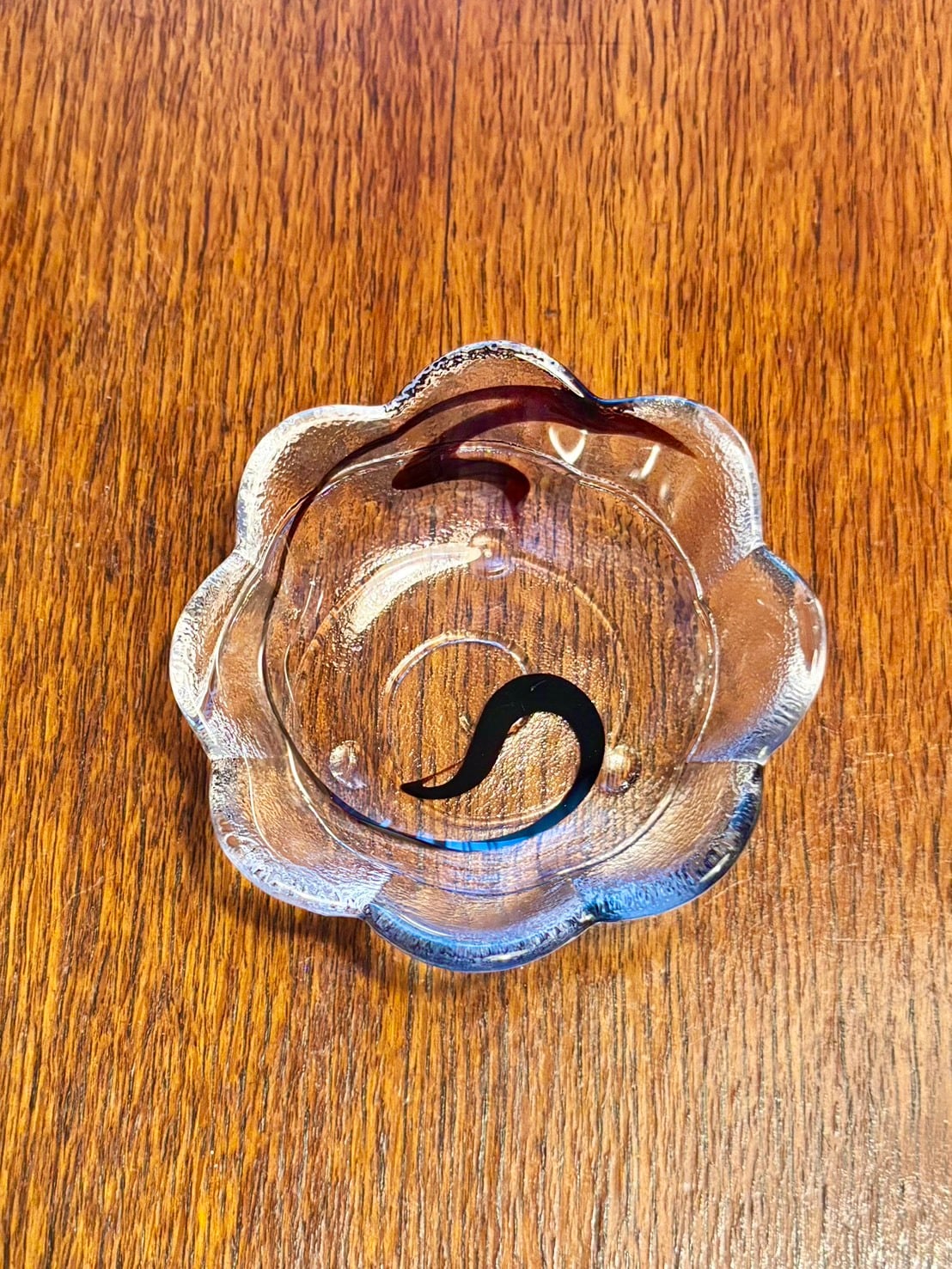 ボルドーの印象的な差し色が入ったガラスの小皿。
