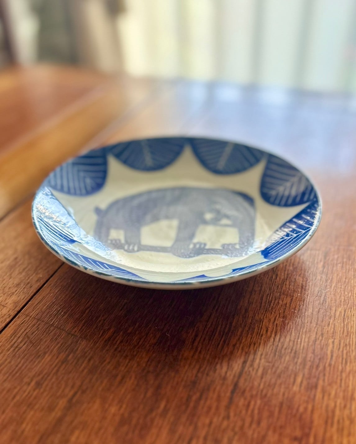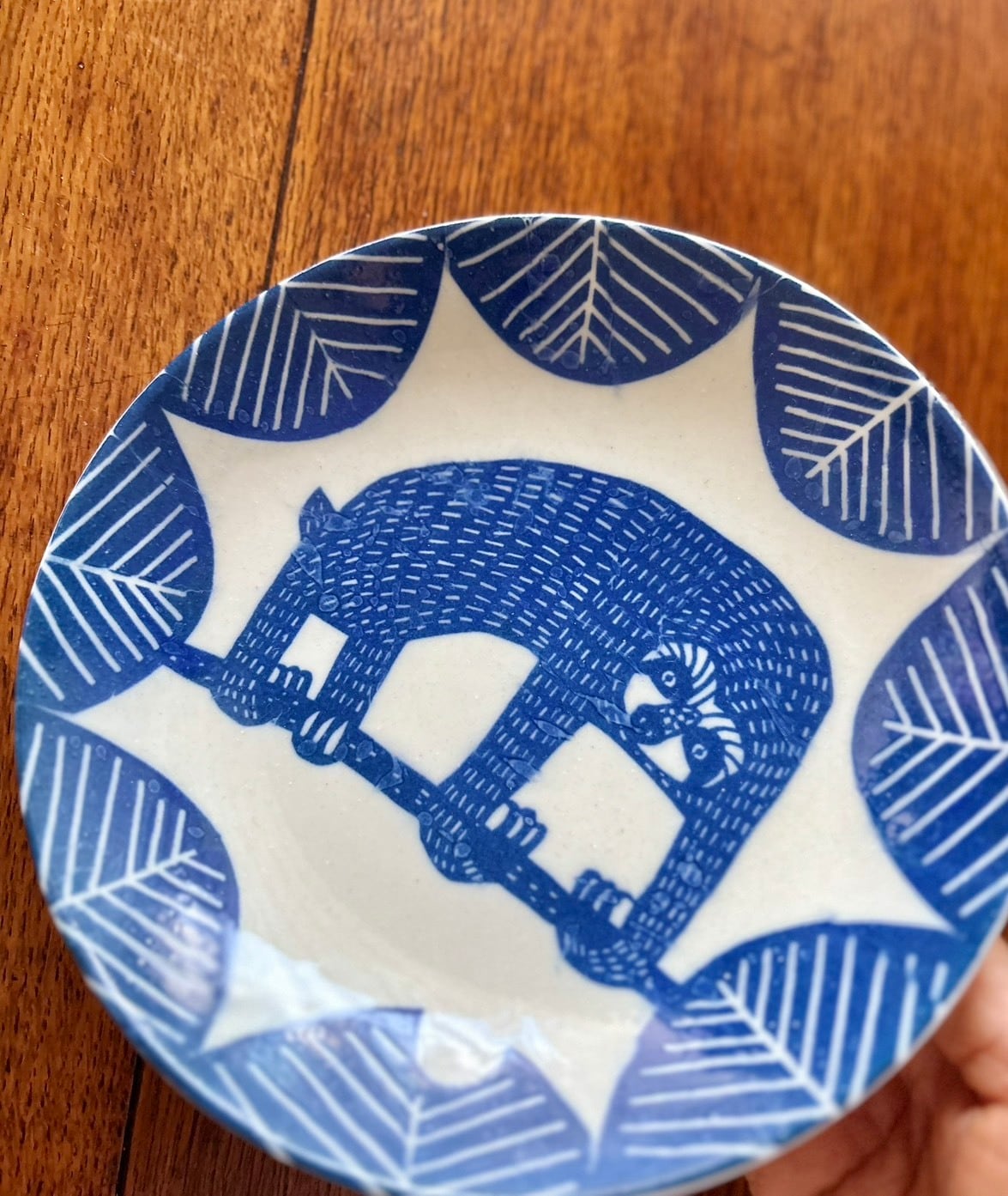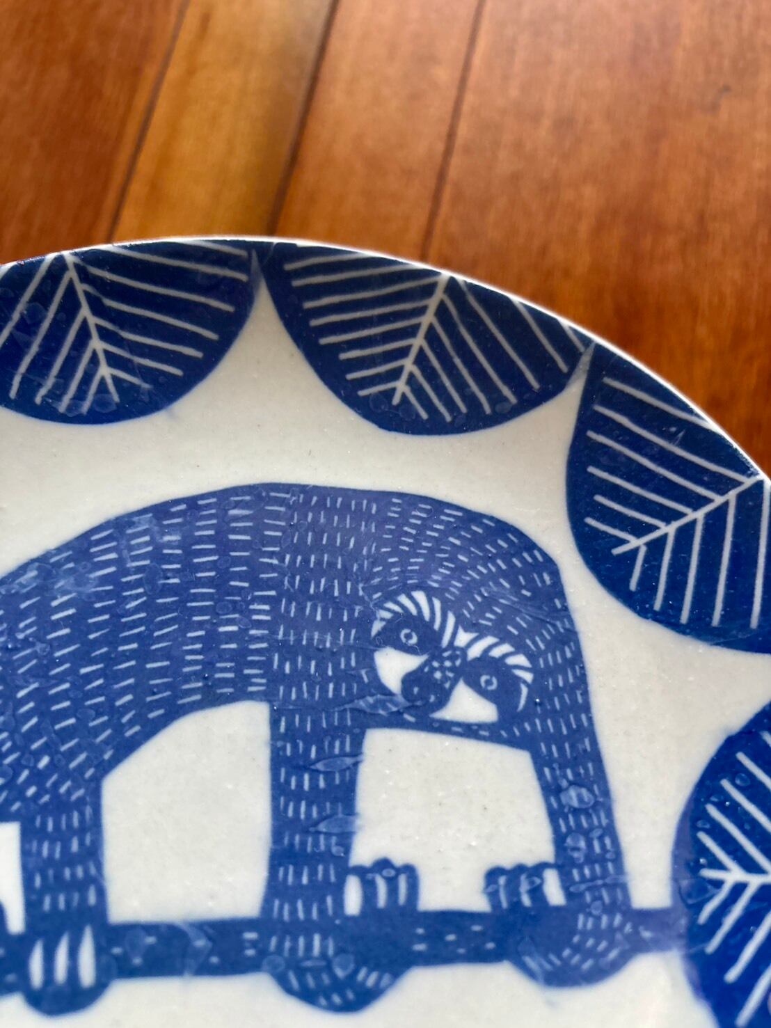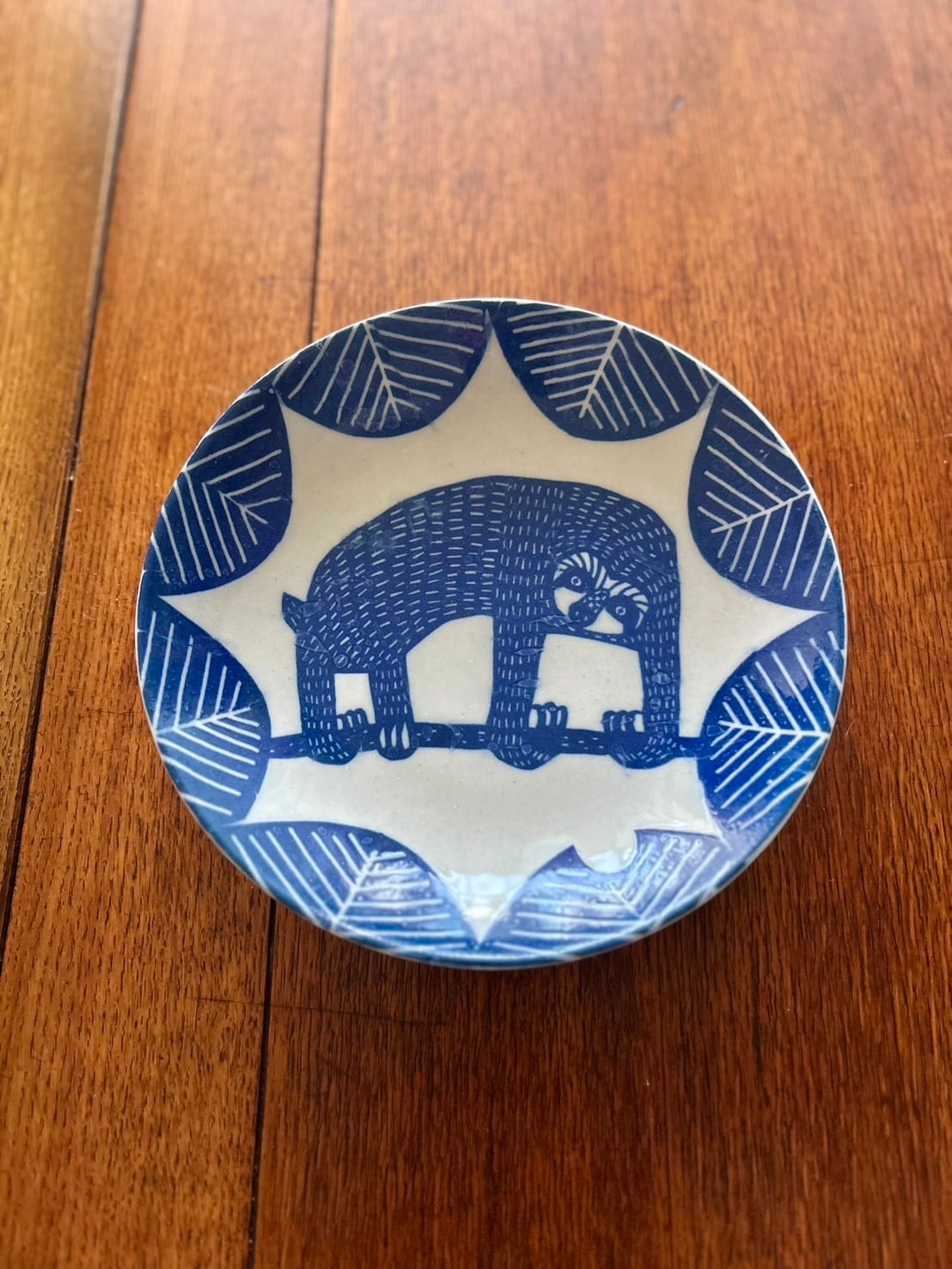 銅板転写特有の掠れや滲みもあって、手仕事の素朴な味わいが感じられる素敵なうつわです。なまけもののユーモラスな姿は、食卓に楽しい雰囲気を与えてくれるでしょう。