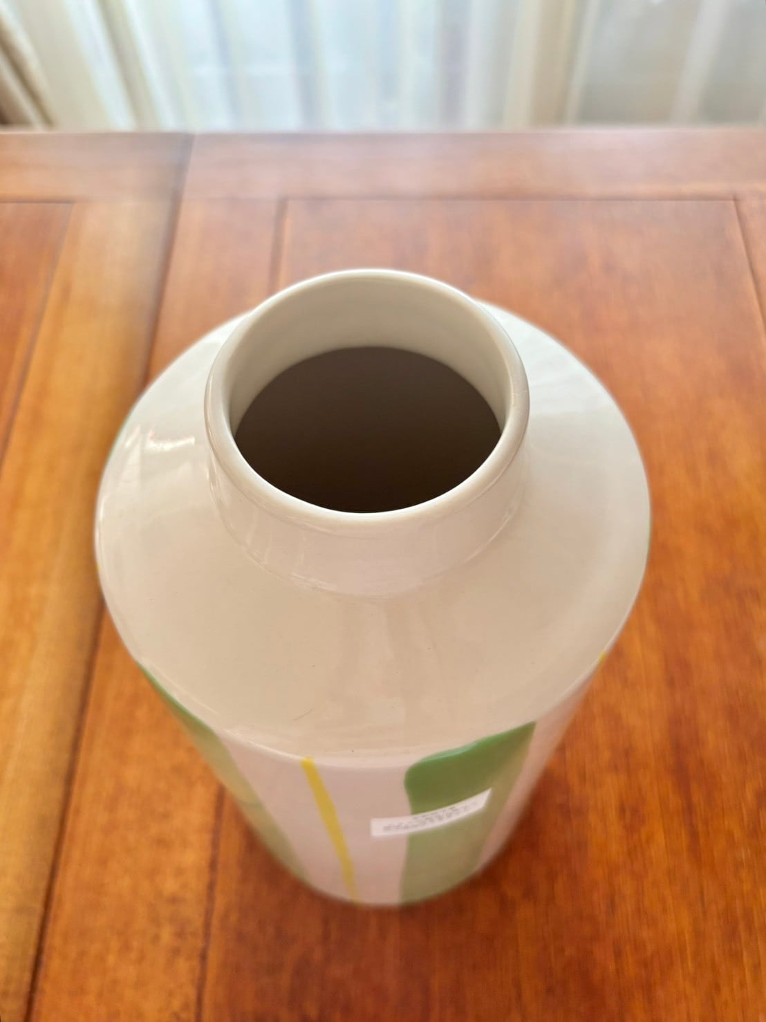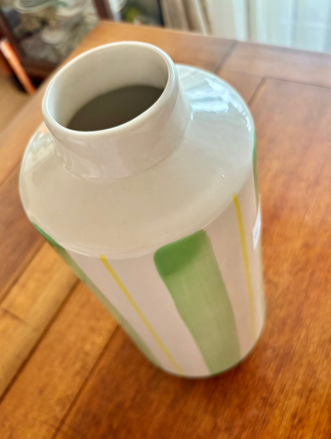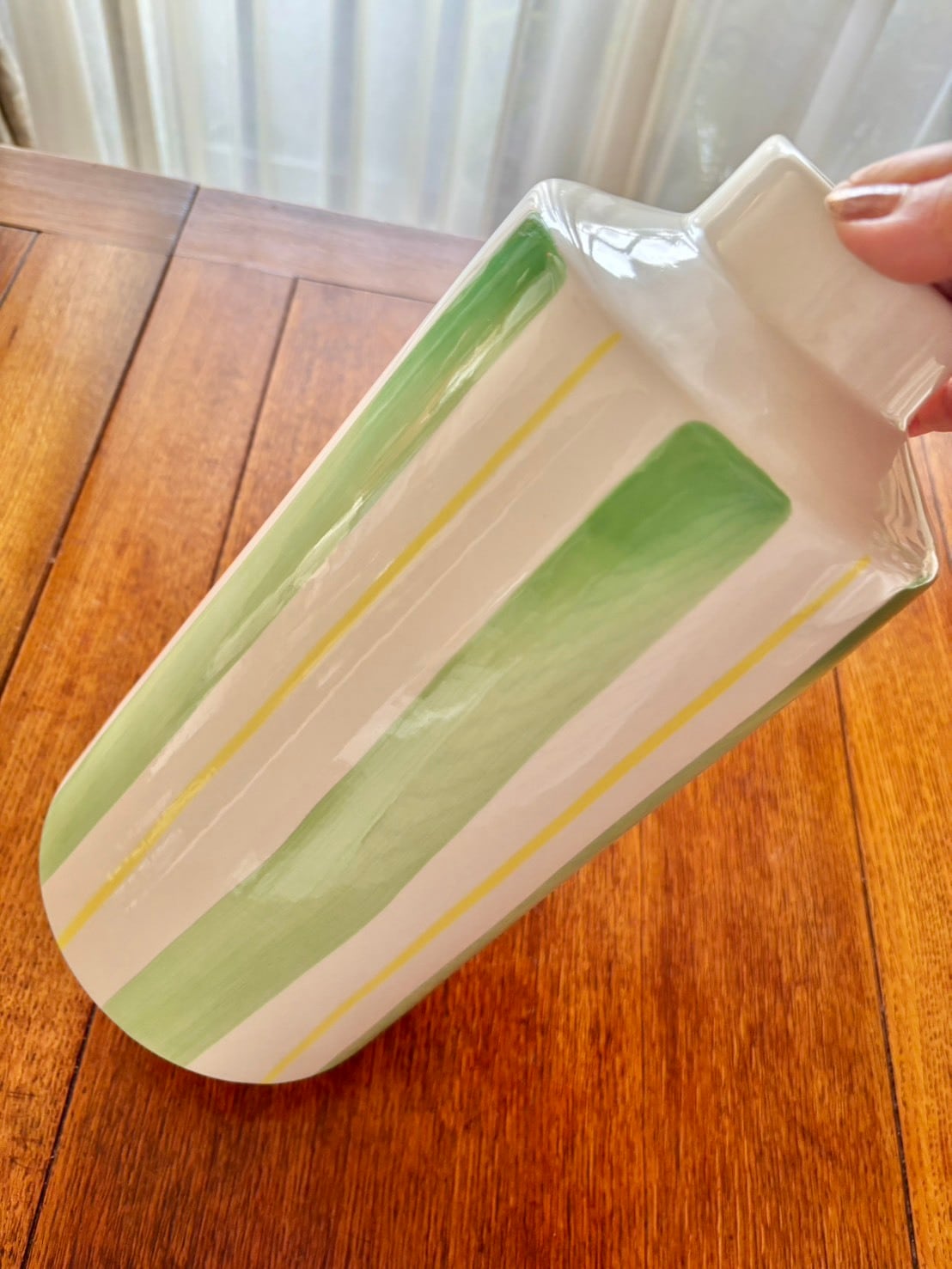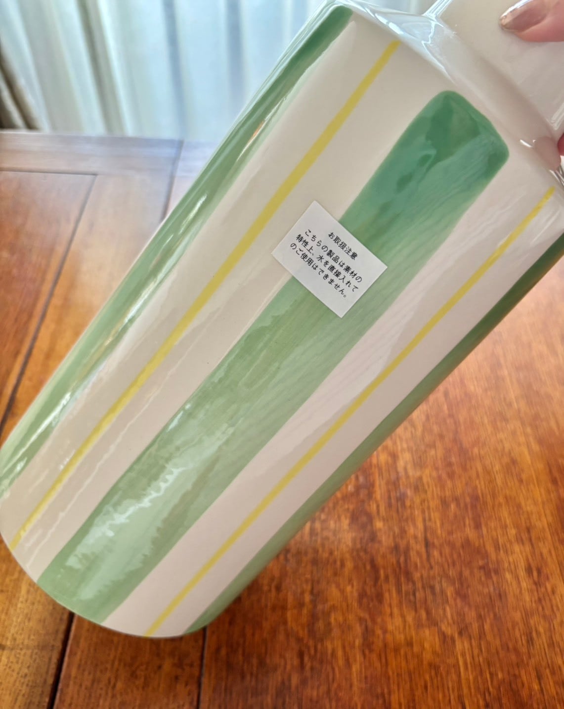 やわらかなオフホワイトの釉薬に、明るく華やかなライトグリーンとイエローのラインが晴れやかな雰囲気を演出してくれます。職人さんの手の動きが感じられて、手仕事の味わいがあります。釉薬の滲み、微妙な濃淡の表情を楽しんでください。