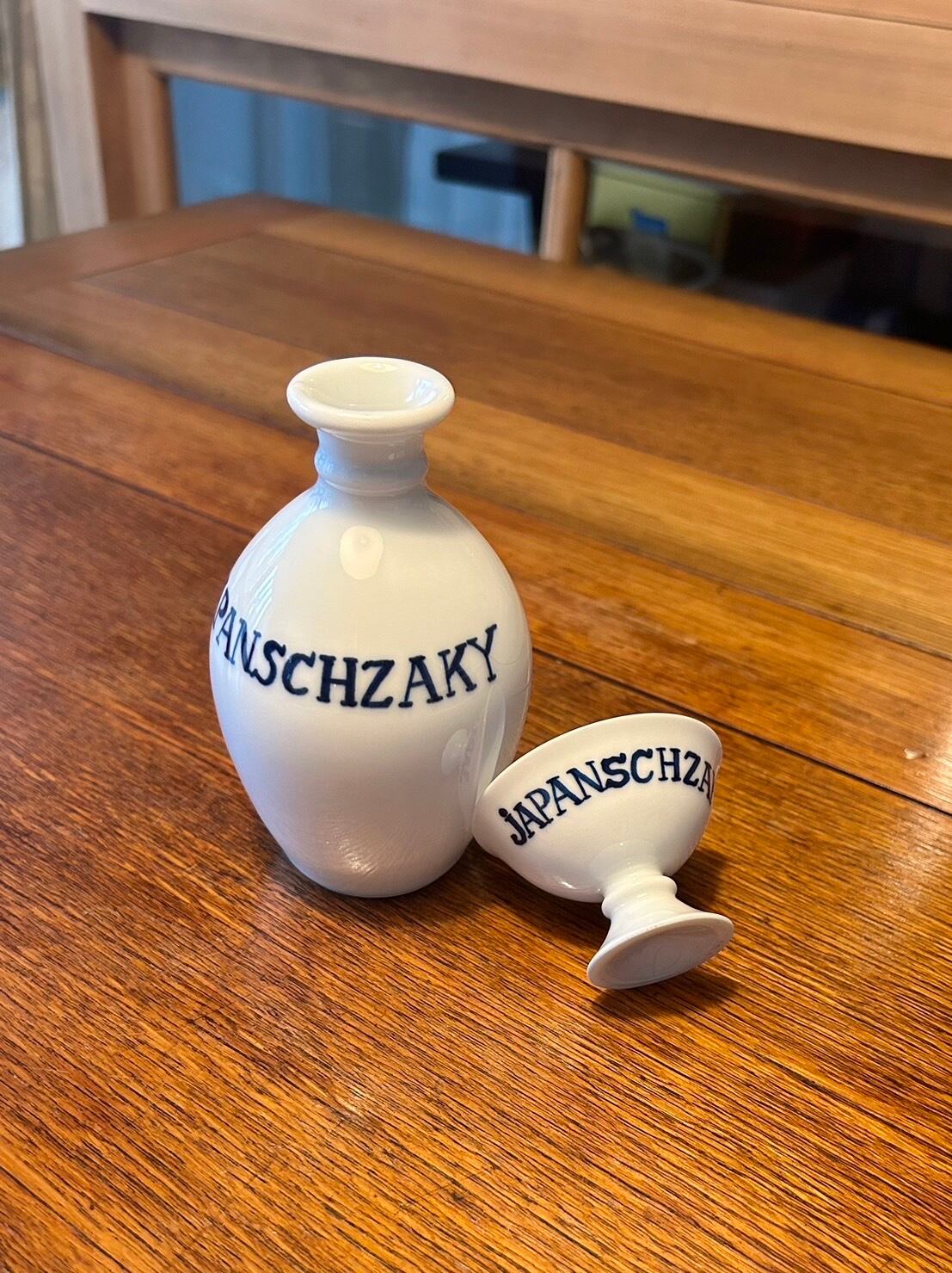 コンプラ瓶(コンプラびん)は、江戸時代に出島から醤油や日本酒を輸出する際に用いられた磁器の徳利型の白い瓶で、蘭瓶とも呼ばれます。この徳利は、そのコンプラ瓶にインスパイアされたものと思われます。「JAPANSCH ZAKY」とは、オランダ語で「日本の酒」という意味。和を感じさせながら、異国情緒を漂わせるこの徳利は、和と洋の両方の器との相性も良いので、食卓に並ぶと楽しい雰囲気が演出できそう。同時に販売中の猪口とセットで使われるといいと思います。6枚目と7枚目の写真は、猪口と徳利を一緒に撮影した参考写真になります。