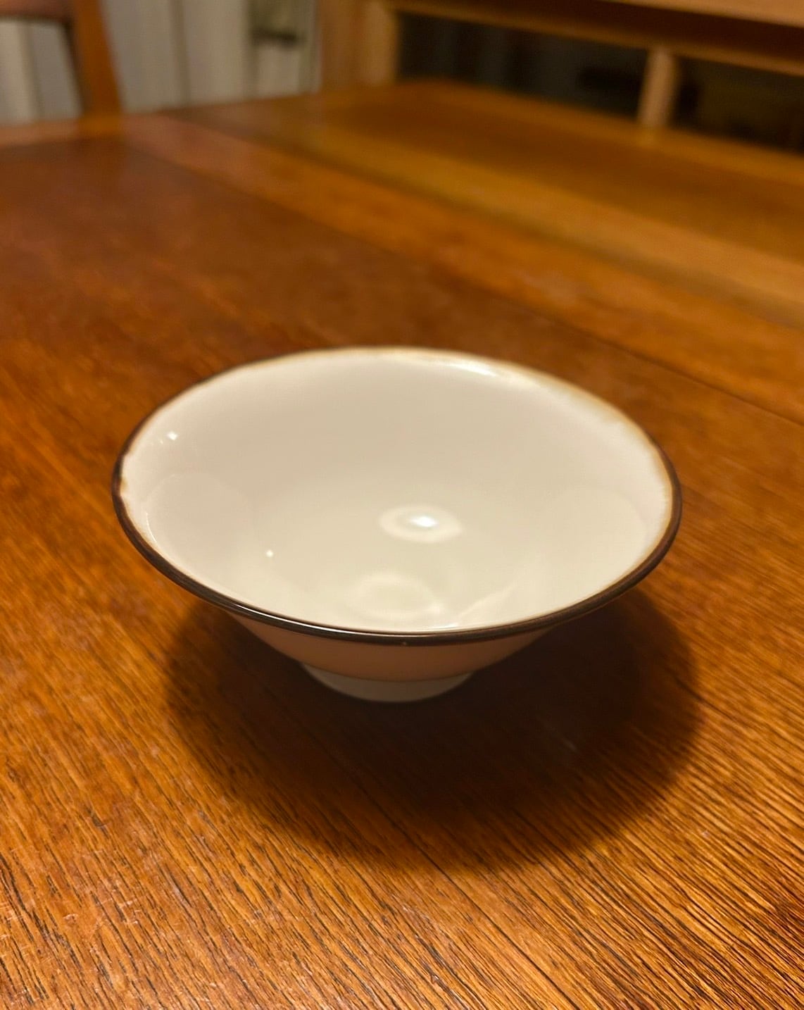 This is tableware made by Imamura Seitou in Saga Prefecture. The glossy cream-colored tableware has a brown rim. It has a simple and beautiful form. It can be used as a rice bowl or a small bowl. It would also be good for serving sweets such as douhua.