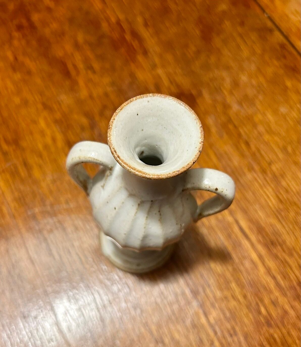 This is a work by Taro Kawamoto, a ceramic artist from Saga Prefecture. It is a warm piece made with reddish clay and white glaze, with the color of the clay showing through in places. It would be great for arranging flowers or as an interior decoration.